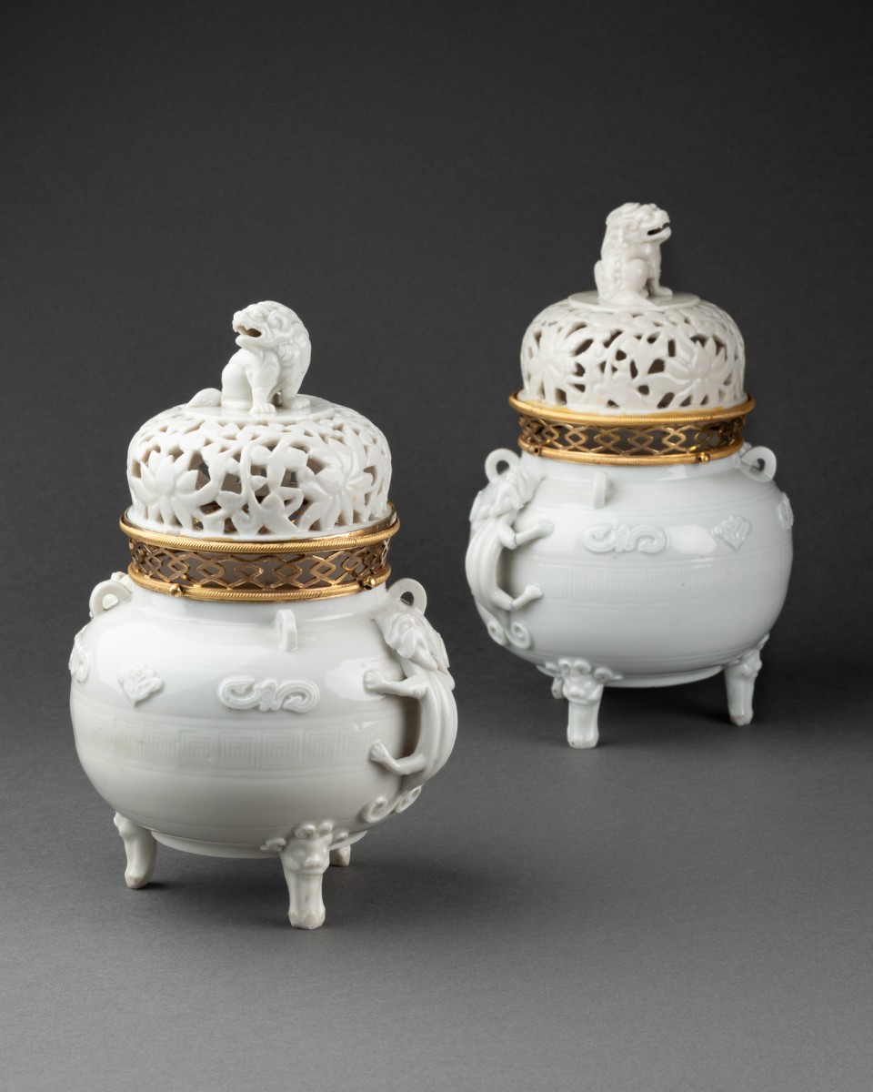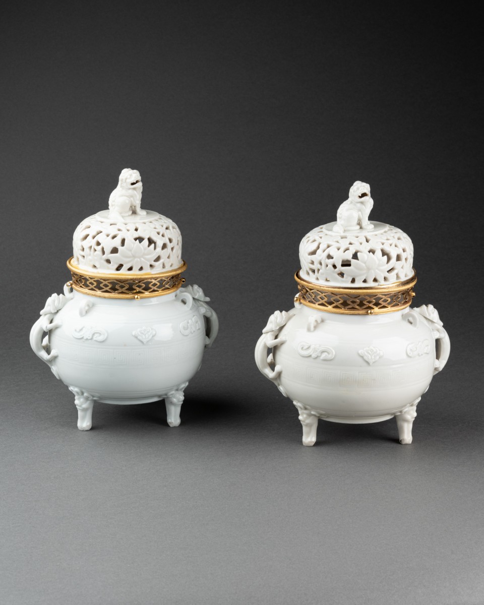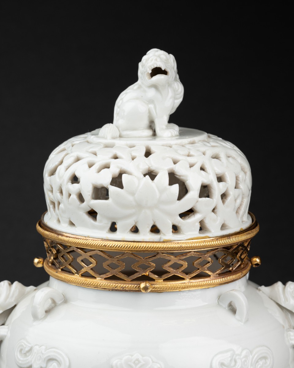 The stoppers are surmounted by Foo dogs and are made of reticulated porcelain with an openwork decoration of finely incised lotus flowers. The incense burners were adapted at the end of the 18th century with a finely chased and mercury-gilded bronze mount, consisting of an openwork gallery with a lozenge pattern, framed by a delicately guilloché border.