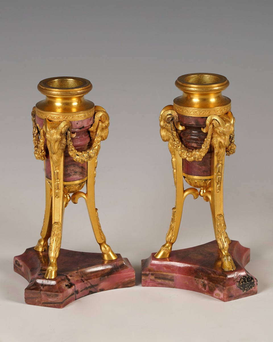 The combination of gilt bronze and rhodonite, a decorative material rare in European decorative arts, places these candlesticks within the tradition of early nineteenth-century luxury, in the Neoclassical taste. The quality of the gilding, still well preserved, together with the precision of the stone carving, suggests a commission intended for an aristocratic or grand ceremonial interior. The whole displays remarkable stylistic and material coherence, illustrating the alliance between lapidary arts and gilt-bronze furnishings in European decorative arts.
