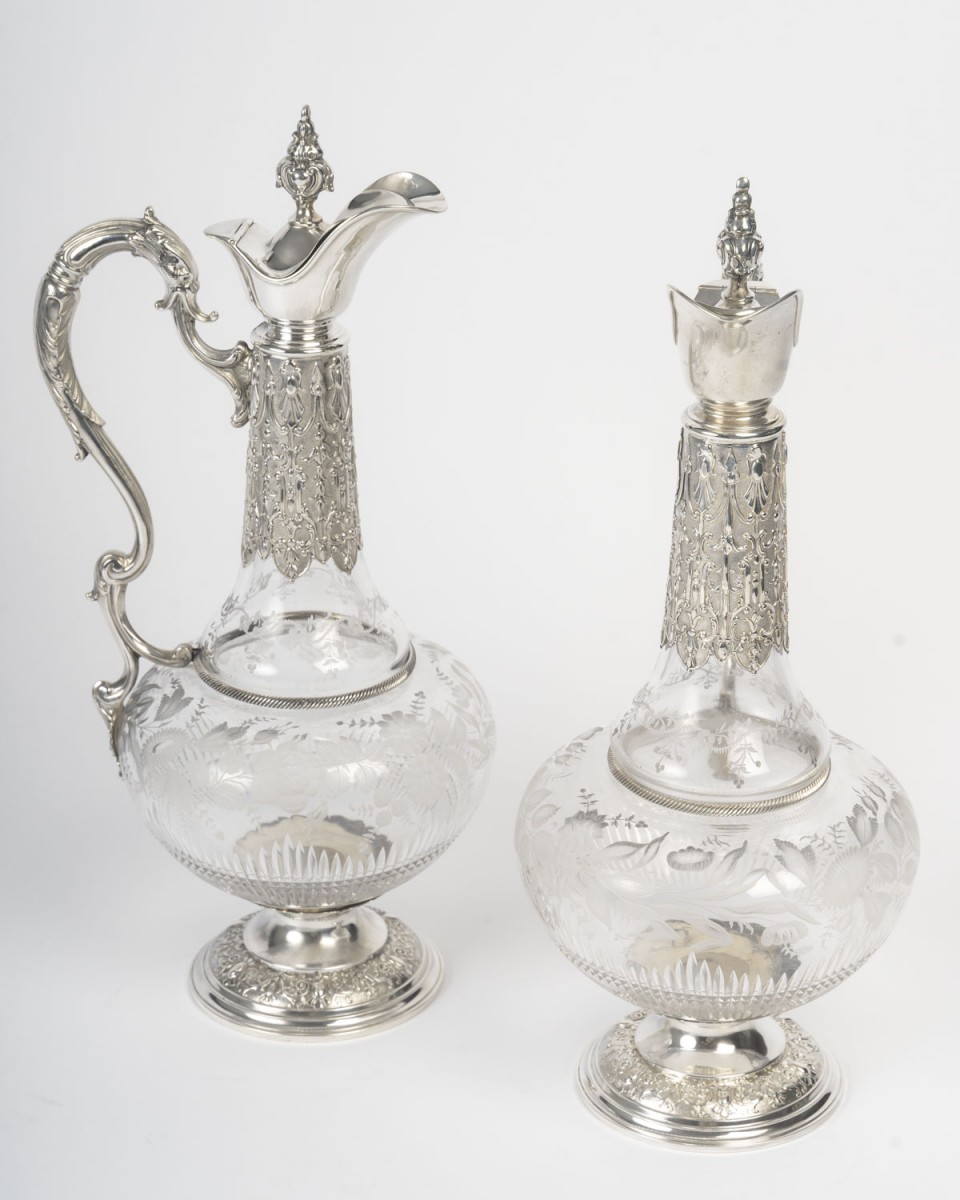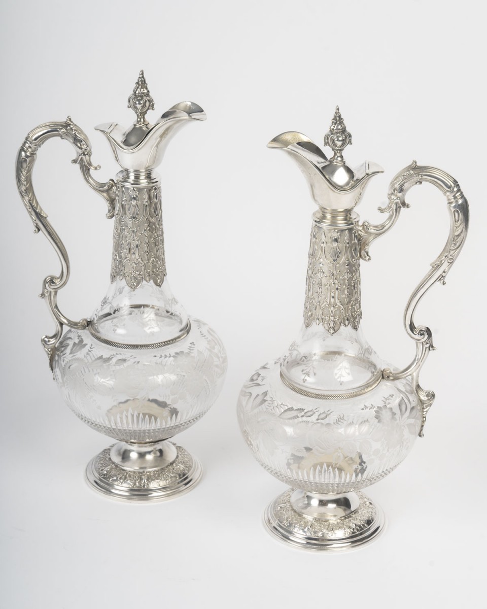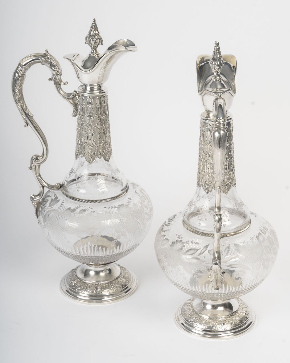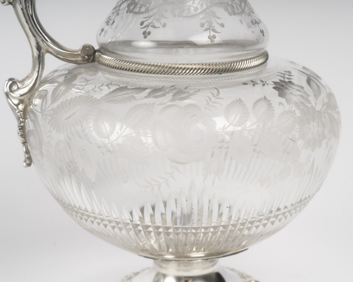 A pair of cut and engraved crystal ewers, mounted in chased silver. The globular crystal body features an acid-etched decoration of floral garlands, foliage, and stylized branches, rendered in a satin-like reserve on a transparent ground. The lower section is embellished with diamond-point cuts and radiating gadroons, enhancing the light-catching effect.