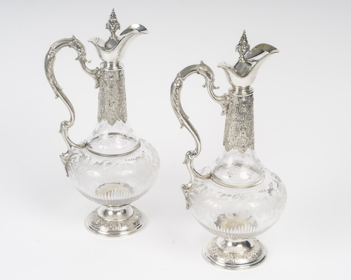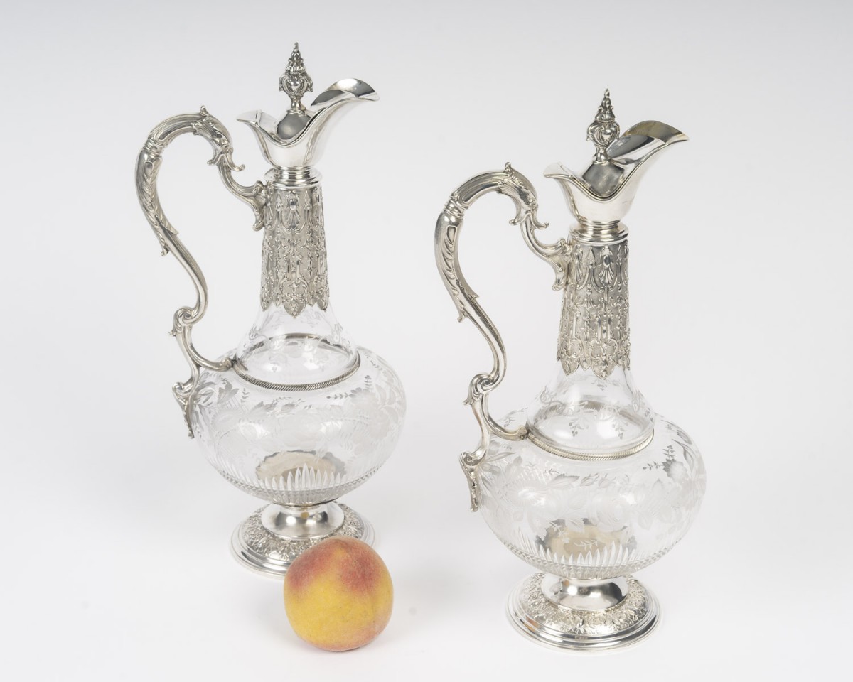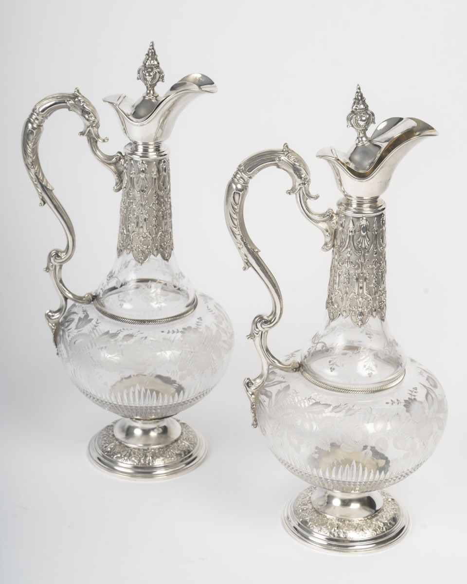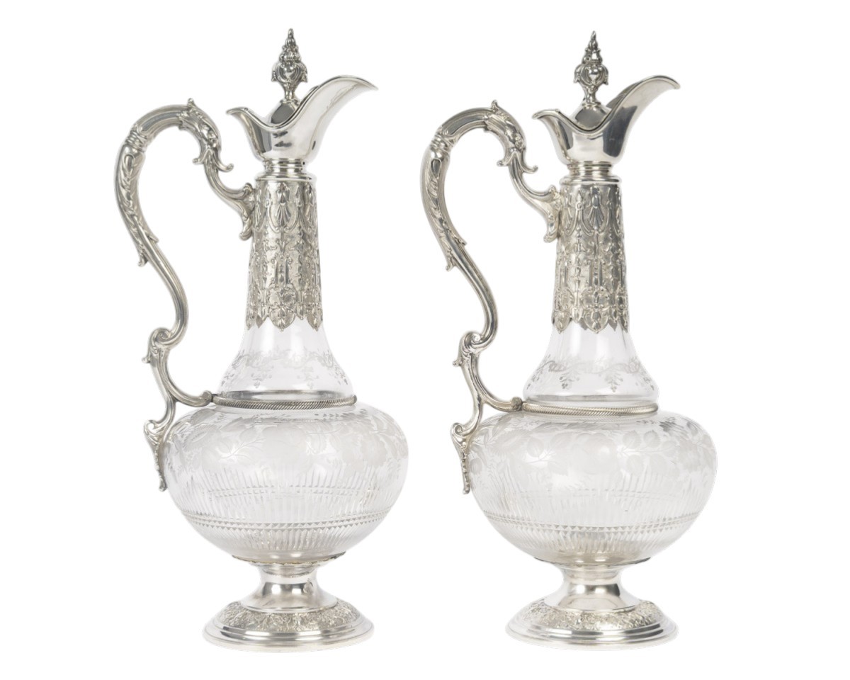 A pair of cut and engraved crystal ewers, mounted in chased silver. The globular crystal body features an acid-etched decoration of floral garlands, foliage, and stylized branches, rendered in a satin-like reserve on a transparent ground. The lower section is embellished with diamond-point cuts and radiating gadroons, enhancing the light-catching effect.