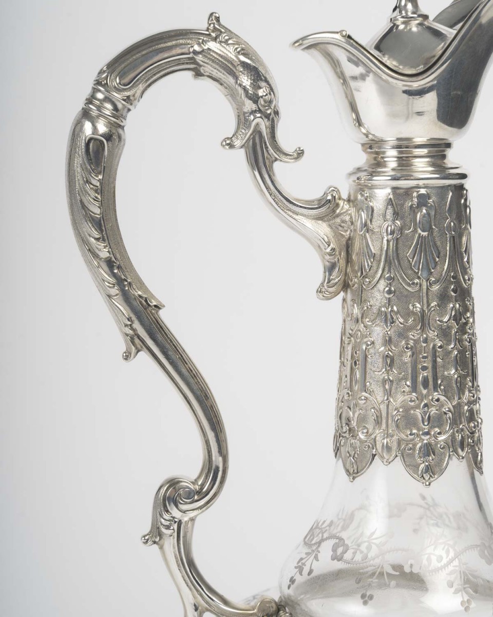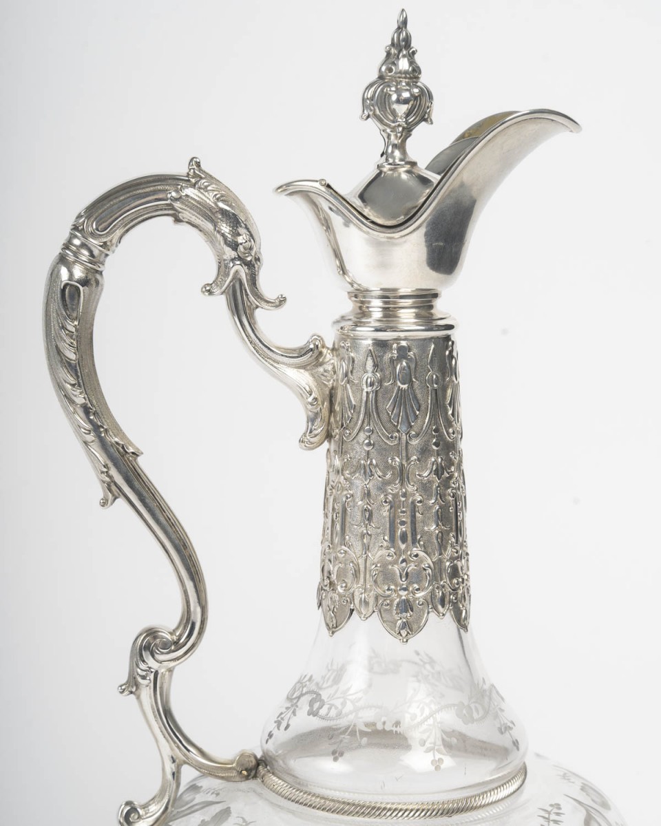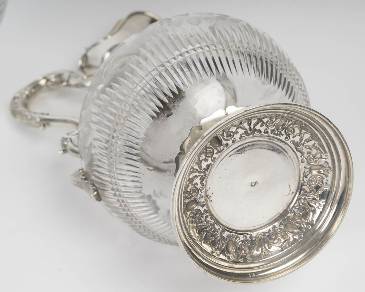 A characteristic example of fine silversmithing, combining engraved floral decoration on the crystal with rich chasing on the silver mount.