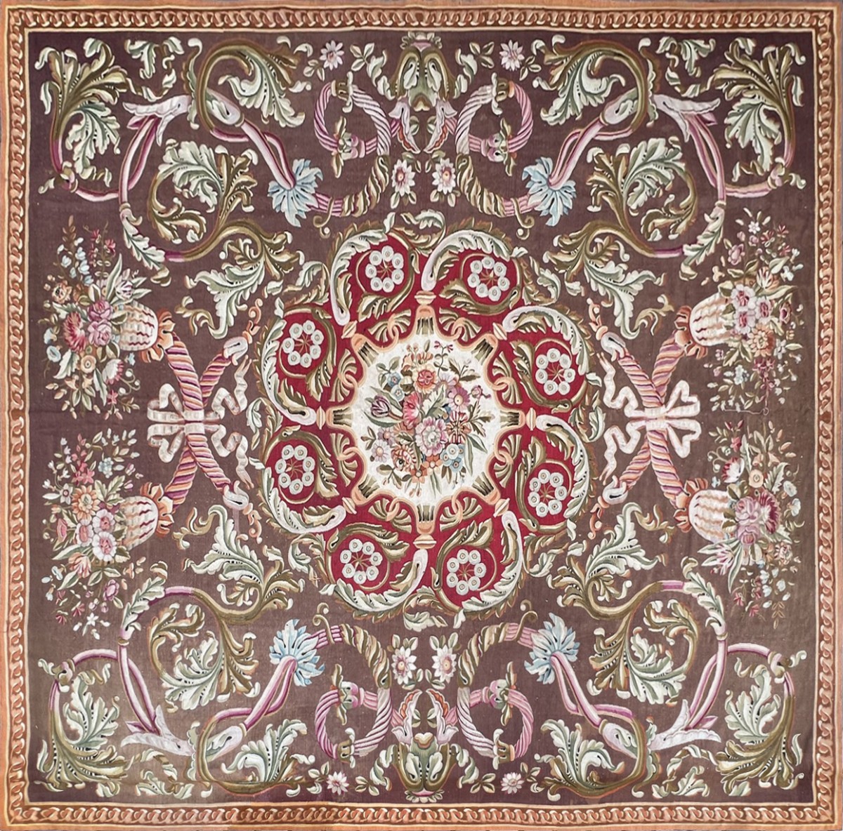 The Field: The background, a deep tobacco brown, is richly enlivened by elegant acanthus scrolls in almond-green and cream tones. At the four corners and along the central axes, cornucopias and flower baskets are linked by intertwined pink ribbons, lending an almost ethereal lightness to the whole.