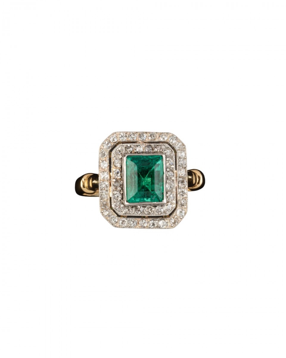 18k gold, platinum, and Colombian emerald ring (1.31 carat, Gem Lab certificate), double diamond halo, French work, late 19th century, Weight: 4.7g