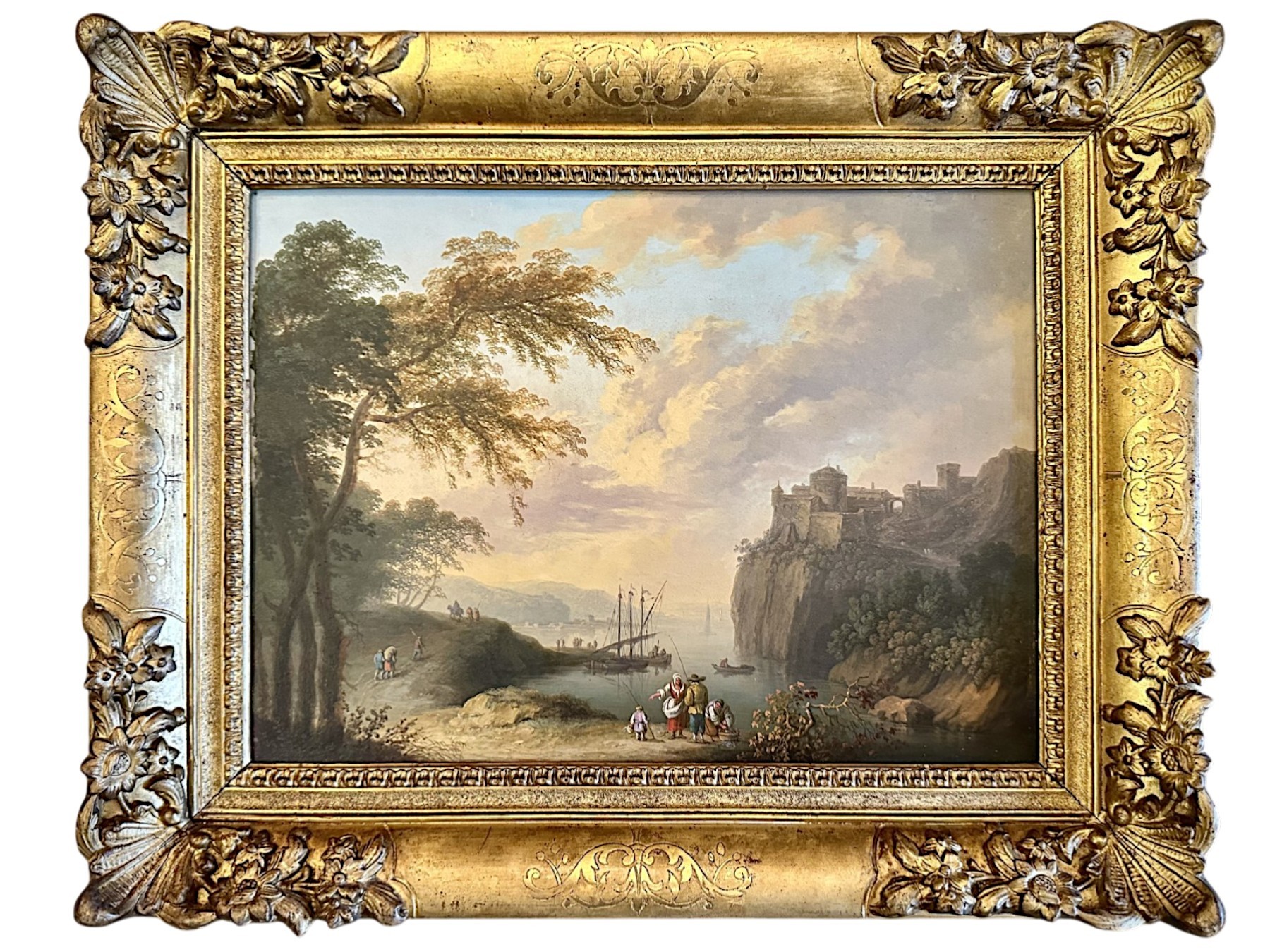 Close to Joseph Vernet in Rome in the 1750s, Lacroix de Marseille returned to France around 1776, where he achieved great success with his numerous seascapes bathed in soft southern light, very similar to the works of his contemporary. He used recurring elements in his compositions, often imaginary. Charles-François Lacroix de Marseille distinguished himself in the 18th century through his seascapes, inspired by the work of his master, Claude Joseph Vernet. From this brilliant artist, seascapes remain today, depicting figures illuminated by the soft glow of dawn or the reddish hues of sunset. The deliberately lowered horizon line invites the eye to journey out to sea from the shore, enlivened by fishermen near a port at sunset. The artist portrays a group of figures busy at the water's edge, unloading the fruits of their successful fishing onto the bank. Alongside them are a group of figures returning to the village after a day's fishing. This fishing scene, whose location remains uncertain but which can be compared to other compositions by the artist, falls within the tradition of landscapes painted during the Grand Tour, relying solely on his imagination. A fortified city and steep cliffs complete a dense composition, where the sky occupies half the space. Lacroix de Marseille paid particular attention to the representation of atmospheric effects, depicting skies tinged with mist or illuminated by the emergence of a ray of the setting sun. Here, pink and bluish clouds accompany the soft light of the sunset, lending a romantic air to the whole. Oil on copper. Dimensions: with frame, width 50 cm, height 40 cm; without frame, width 38 cm, height 28 cm.