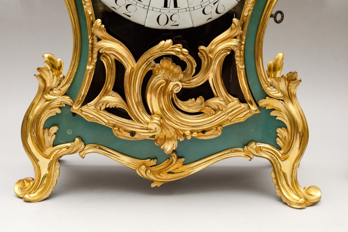 Gorgeous cartel clokc witj its original base from the Louis XV period. Signed by clockmaker Charles Beauvillain master in 1733. Original green color, the surface is in horn. Original gilt bronze with beautiful mercurius gilding. Revised by our clockmaker, it is in working state. Rare on the antiques market.