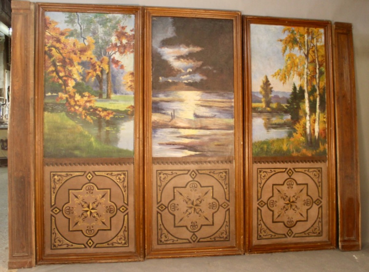 Set of three large panels painted on burlap depicting a rural landscape. Geometric frieze and design adorn the lower portion. The three panels are framed by a molding; three wooden spacers are available. Each panel is 94 cm wide, and the spacers are 22 cm wide. This set can create a striking wall display. Total height: 232 cm