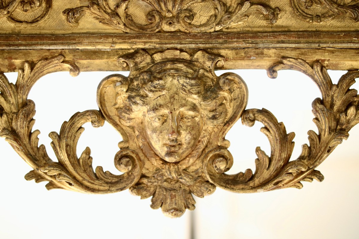 Louis XIV giltwood console table of rare refinement, resting on four legs joined by an X-shaped stretcher, moulded and carved with scrolling foliage centered by a bouquet of leaves. The base is richly sculpted and composed of foliate columns supporting the apron. The apron is decorated with Bérain-style motifs and features a shaped frieze to the front and on each side. The central apron is adorned with a female mask with braided hair.