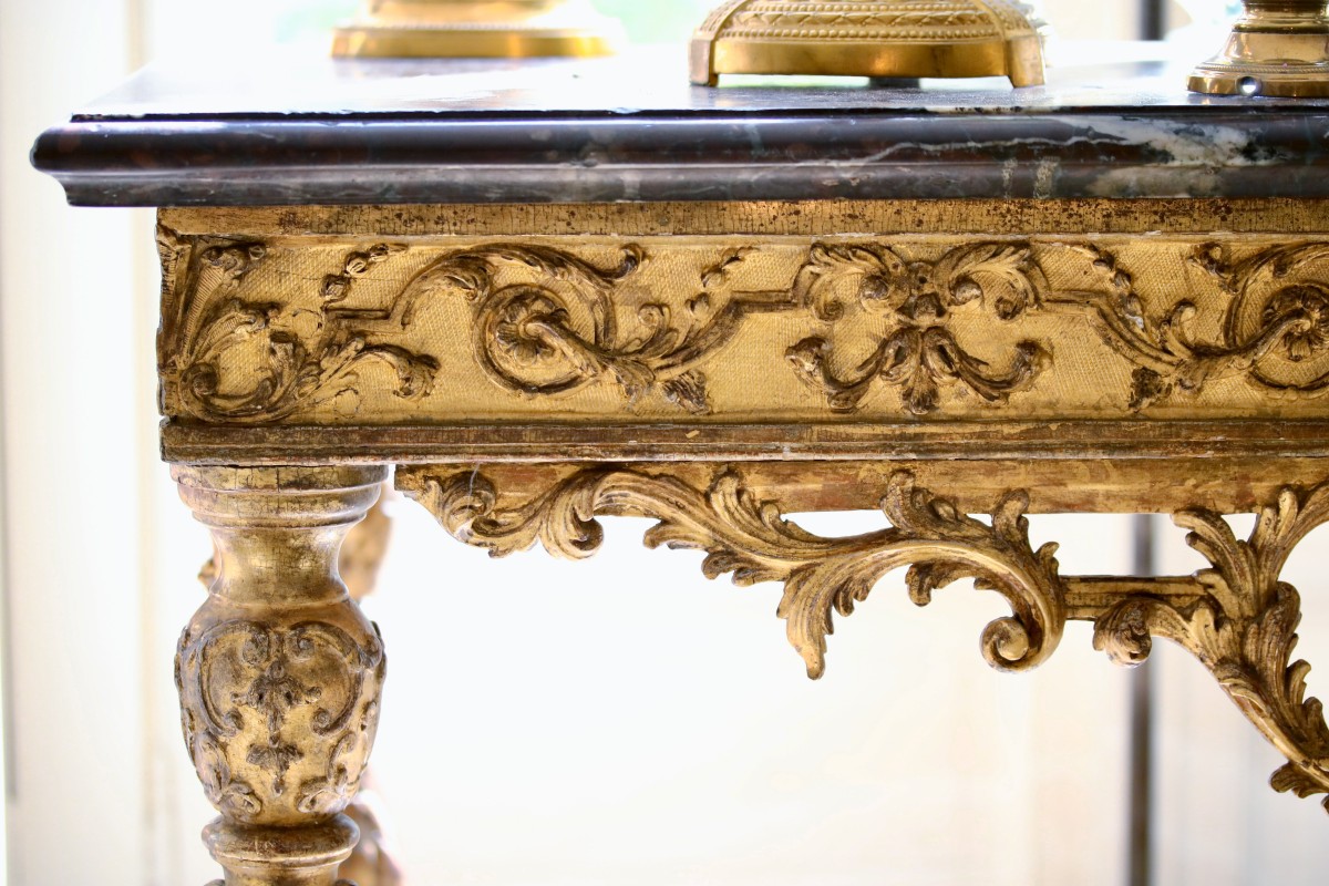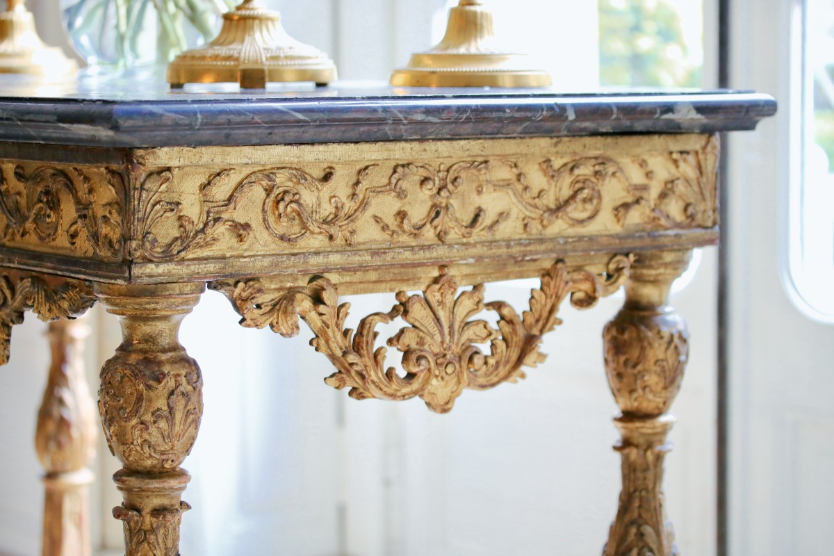 The console is topped with a moulded Campan marble slab.