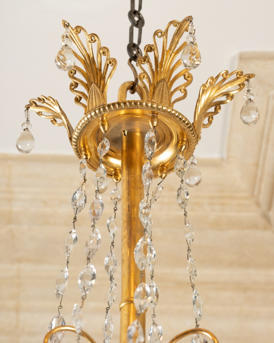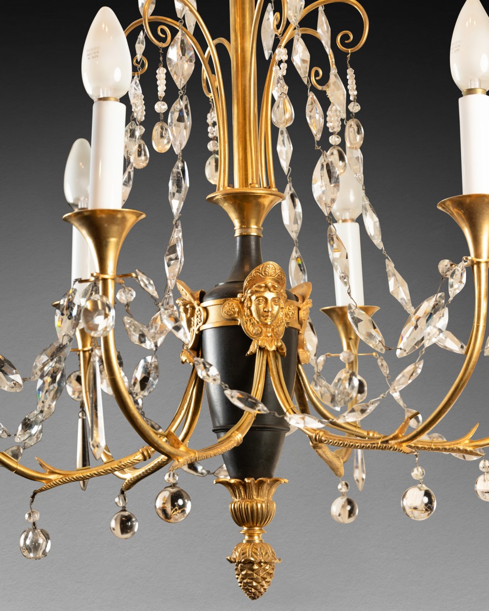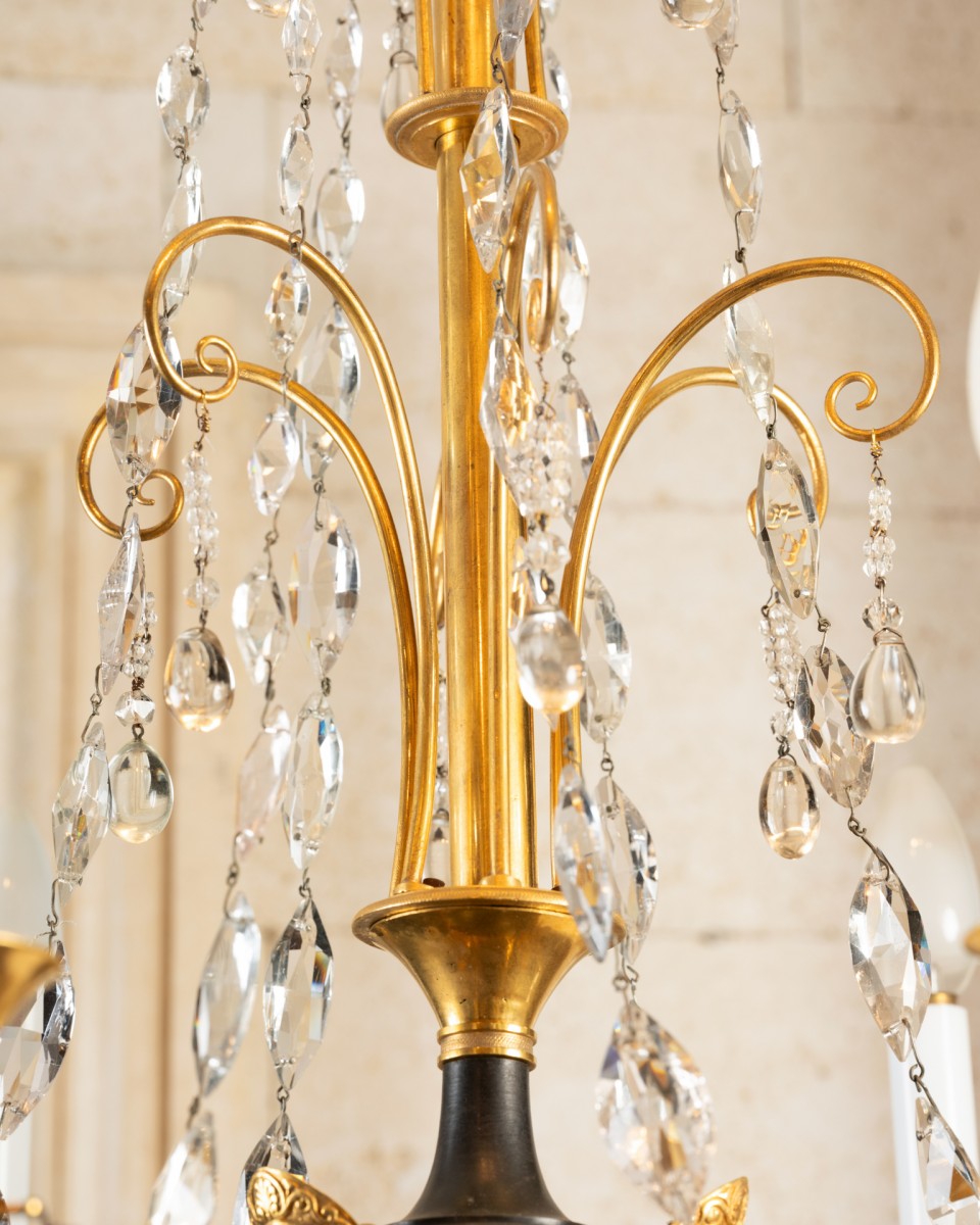 A six-light chandelier composed of a patinated bronze amphora-shaped vase, finished at the bottom with a gilded bronze seed ; embellished at the top with three antique-style women wearing gilded bronze helmets, supporting six horn-shaped branches forming a light fixture, adorned with mirzas and crystal drops, themselves joined by six cut crystal chains. The vase is connected by a central rod, decorated with six, then three gilded bronze crosses, embellished with six almond-shaped cut crystal chains, with a ring at the top, decorated with six gilded bronze palmettes, each with a crystal bead.