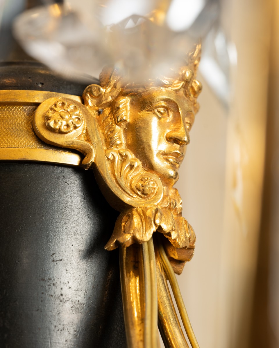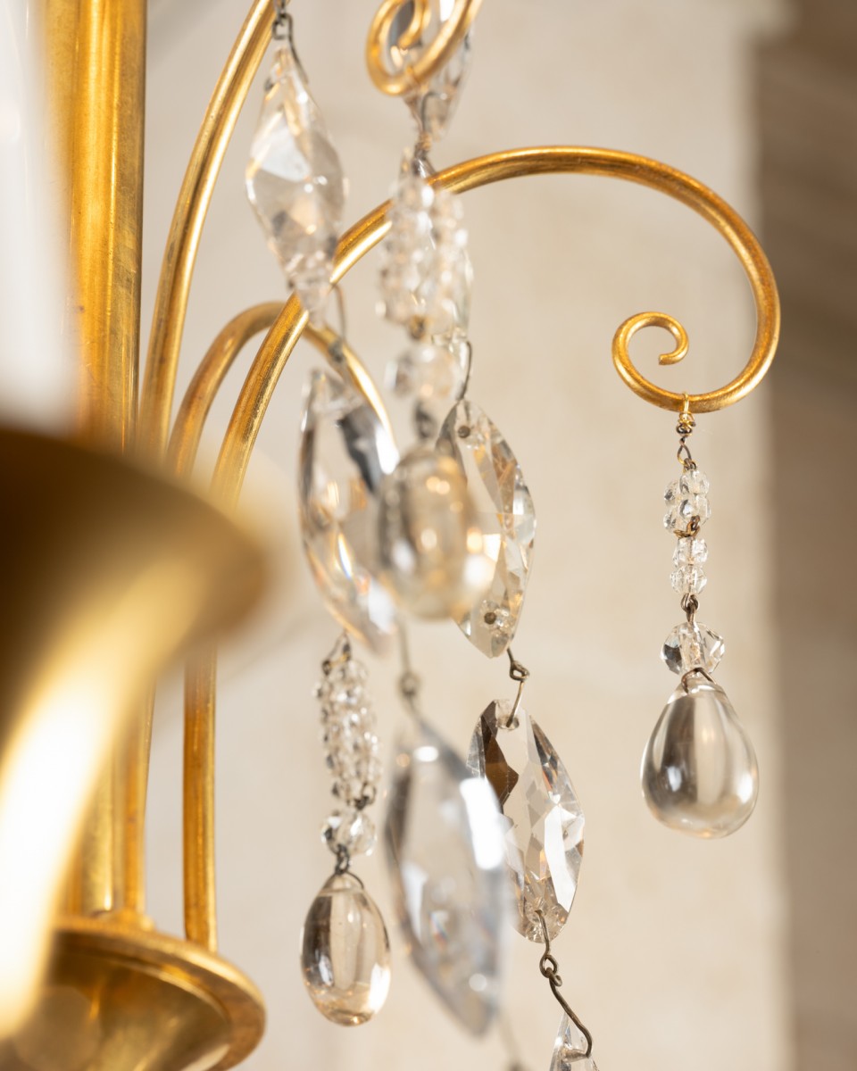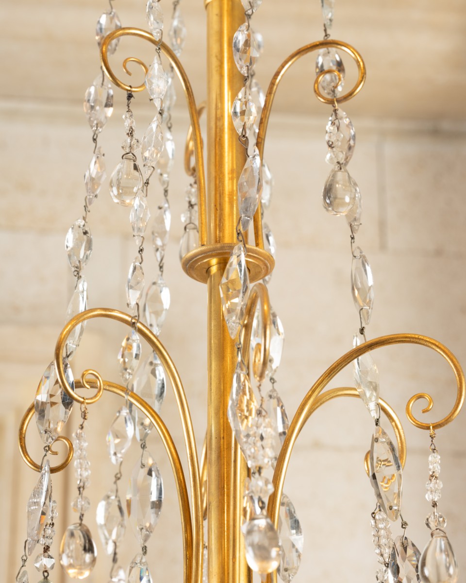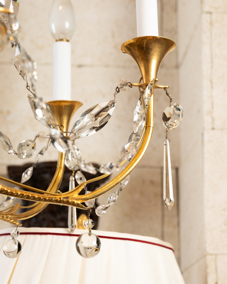 A six-light chandelier composed of a patinated bronze amphora-shaped vase, finished at the bottom with a gilded bronze seed ; embellished at the top with three antique-style women wearing gilded bronze helmets, supporting six horn-shaped branches forming a light fixture, adorned with mirzas and crystal drops, themselves joined by six cut crystal chains. The vase is connected by a central rod, decorated with six, then three gilded bronze crosses, embellished with six almond-shaped cut crystal chains, with a ring at the top, decorated with six gilded bronze palmettes, each with a crystal bead.