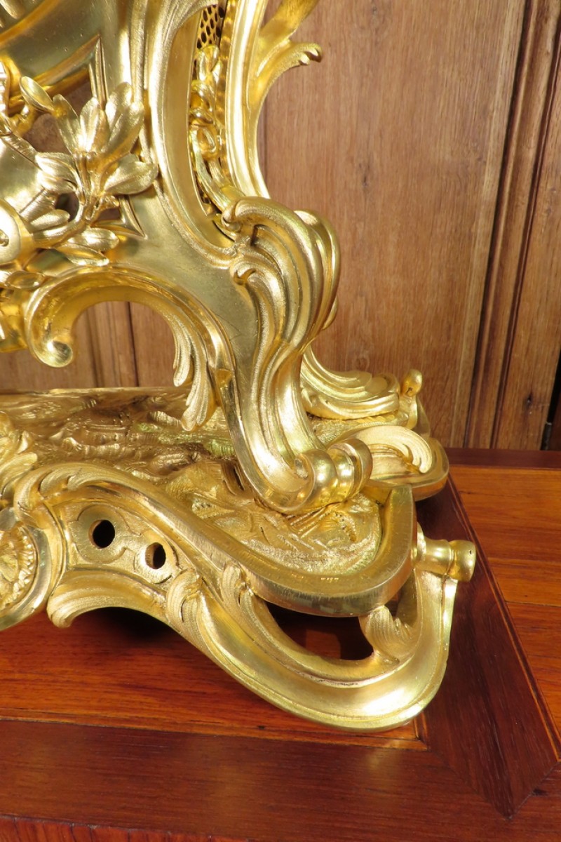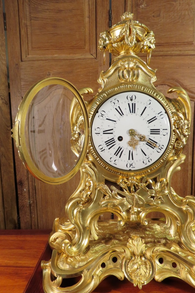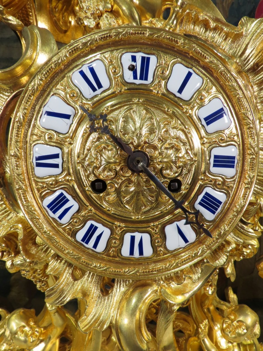 A finely chased and gilded bronze clock in the Louis XV Rocaille style, richly decorated with openwork scrolling foliage, leafy volutes, clasps, and floral garlands. The ensemble is adorned with three small cherubs holding grapes, one of whom rides a ram. The dial features enamel cartouches with Roman numerals.