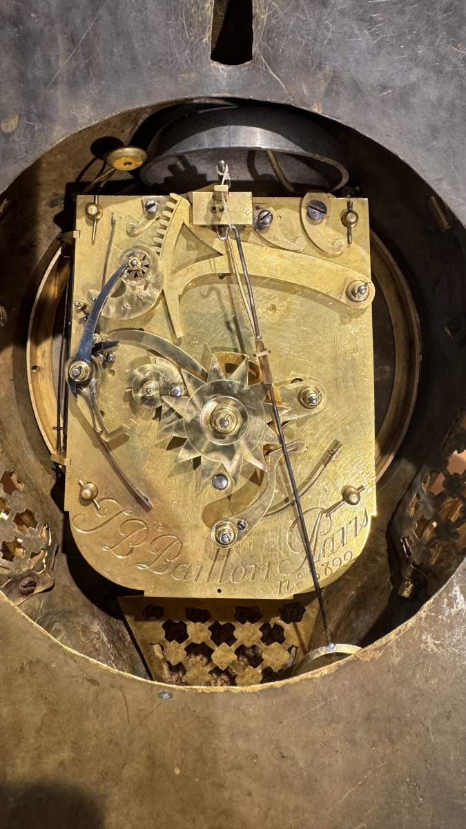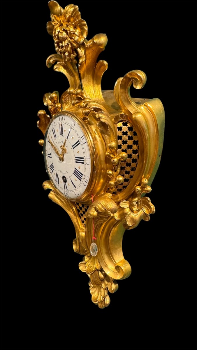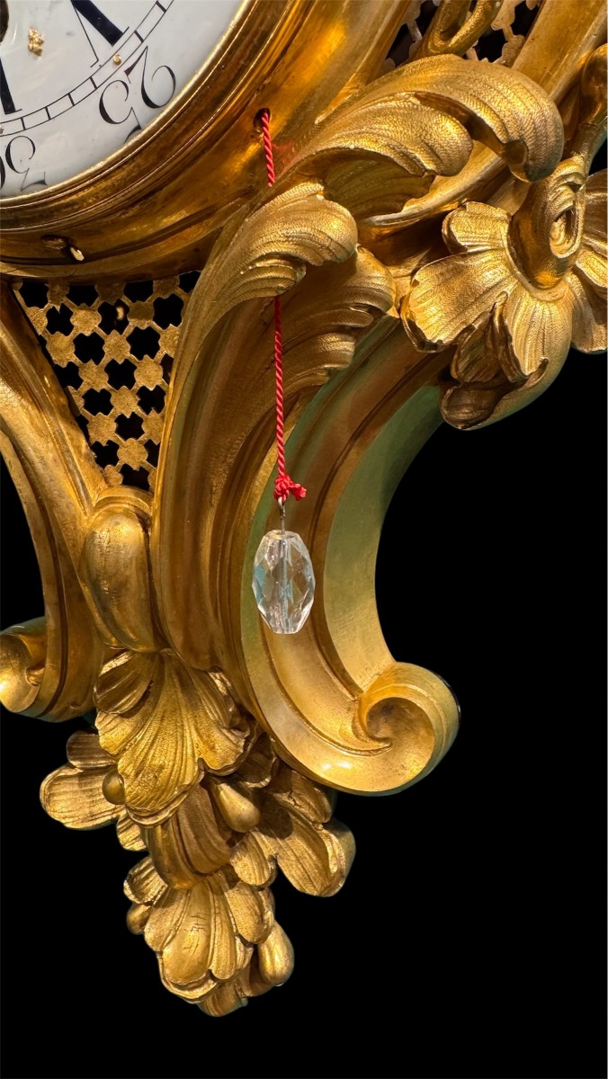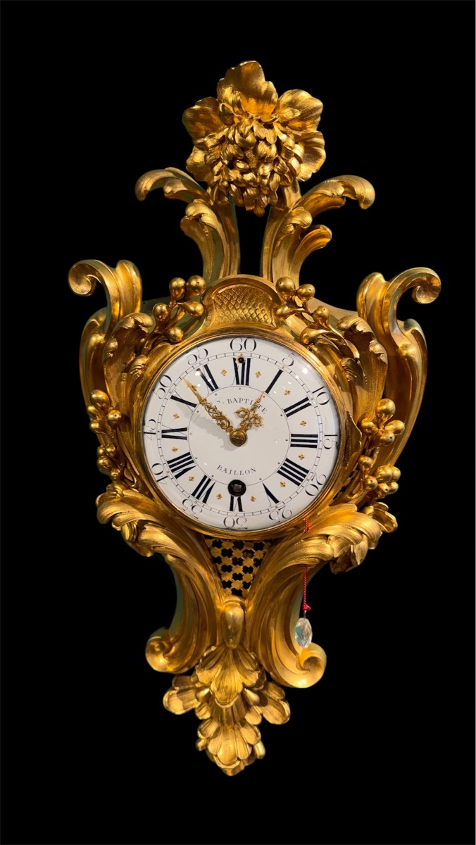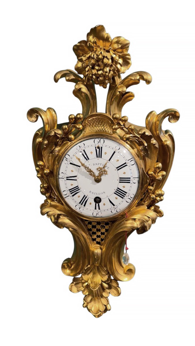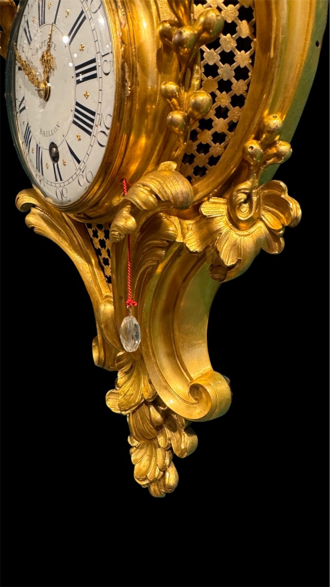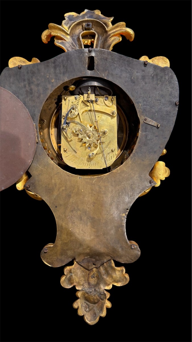 Exceptional and extremely rare Cartel d'Alcove in finely chiseled and mercury-gilded bronze. Dial and back panel signed J. Baptiste BAILLON. Paris. Period: LXV. HxW: 58x24 cm