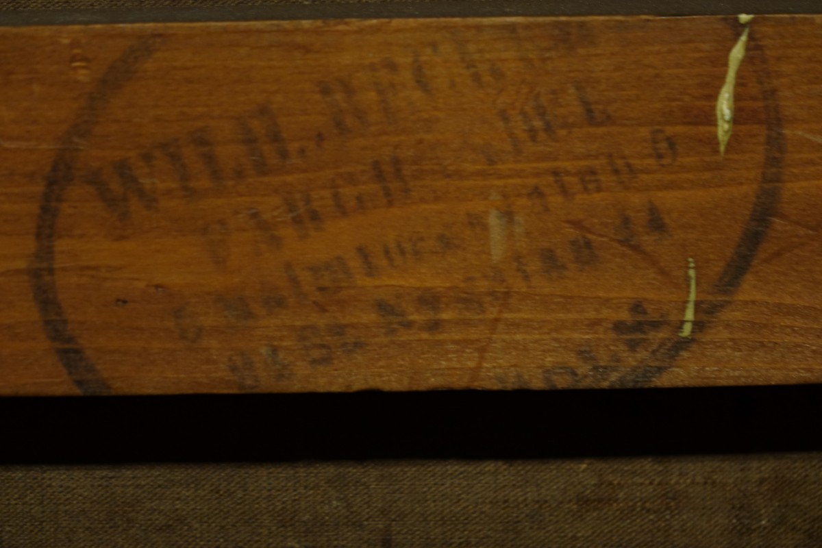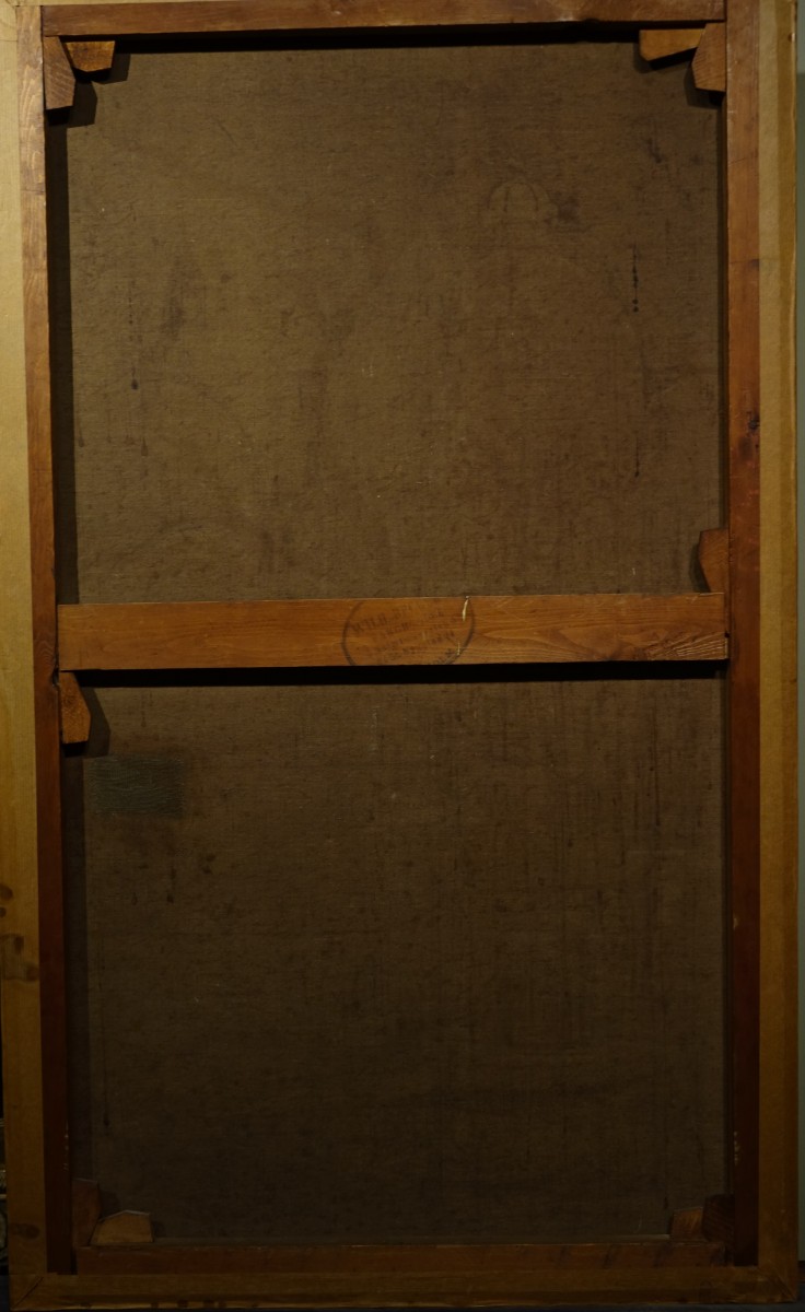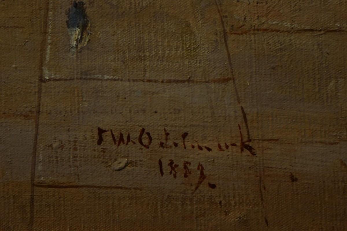 Oil on canvas representing the interior courtyard of the Ducal Palace in Venice, in 1889. German School, bears the signature of Frans Wilhelm Odelmark, and the date 1889. Very beautiful light capture of this courtyard, with on the right the facade of Antoine Rizzo (1483-1498), in the background the Clock and the Foscari arch which opens onto the Giants Staircase. Good condition. Giltwood frame 60x 100. Frans Wilhelm ODELMARK , sweedish school, born in 1849. The museun of Stockholm belongs a painting from him.