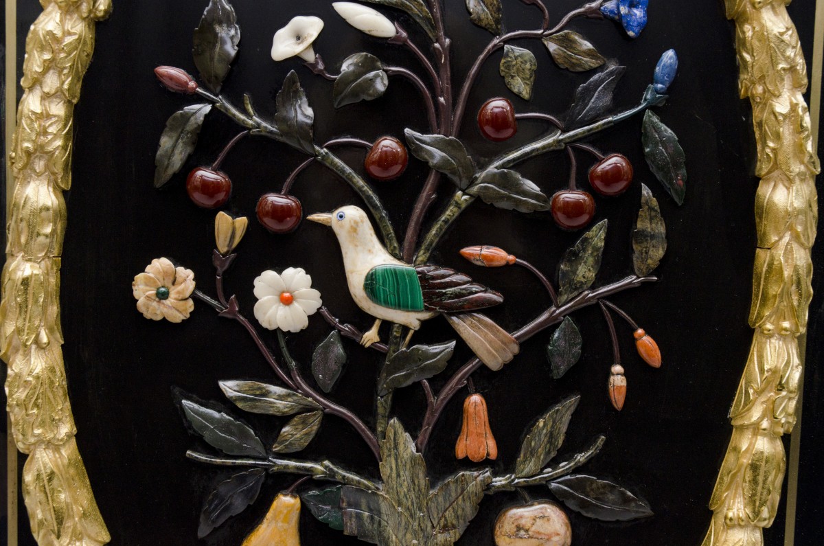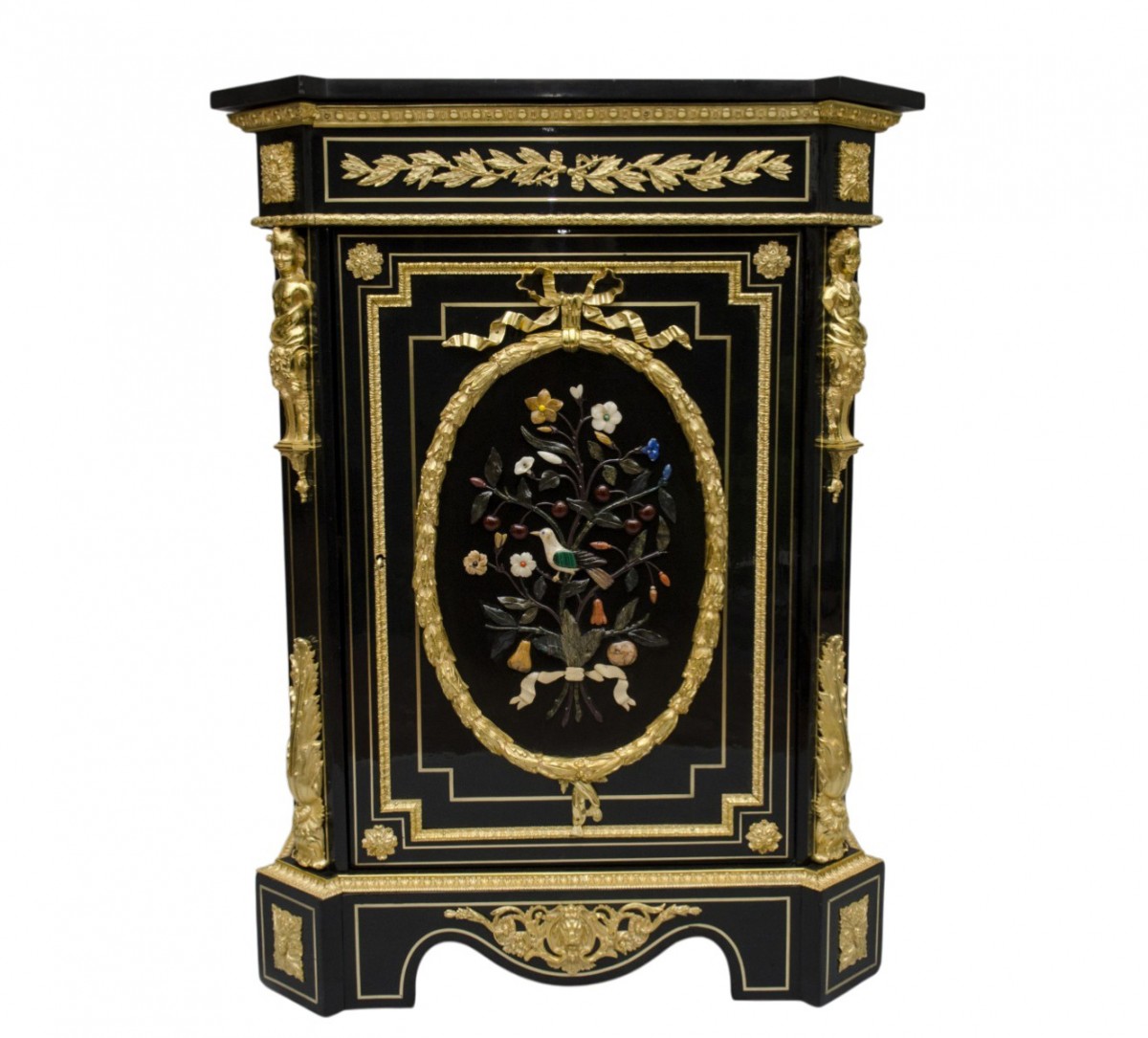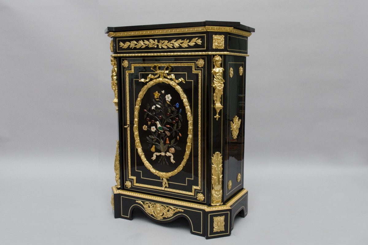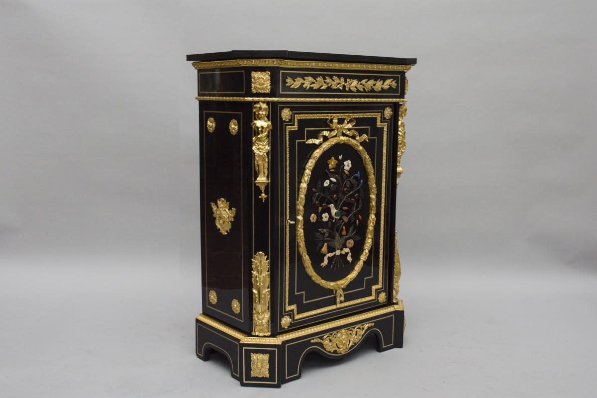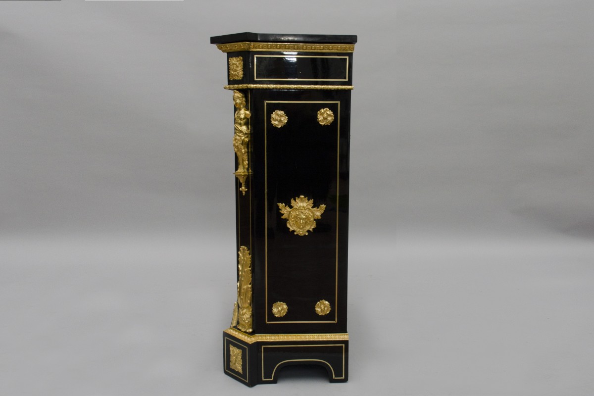 “Meuble d’appui” furniture, bearing the mark of Mathieu Béfort (1816 - active until 1880), known as BEFORT JEUNE. Beautiful furniture in black veneer, the door is adorned with marquetry of marbles, “Pietra dura”. Rich bronze ornamentation, like the frieze of styled flowers and grape fruit, frieze of acanthus leaves. Foliage on the door sides ending with busts of women. On the sides, masks of men topped with foliage. Base plinth cut out. Topped with a black marble from Belgium.