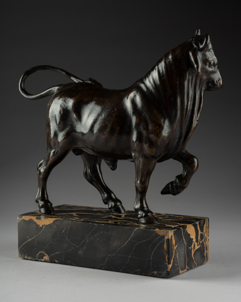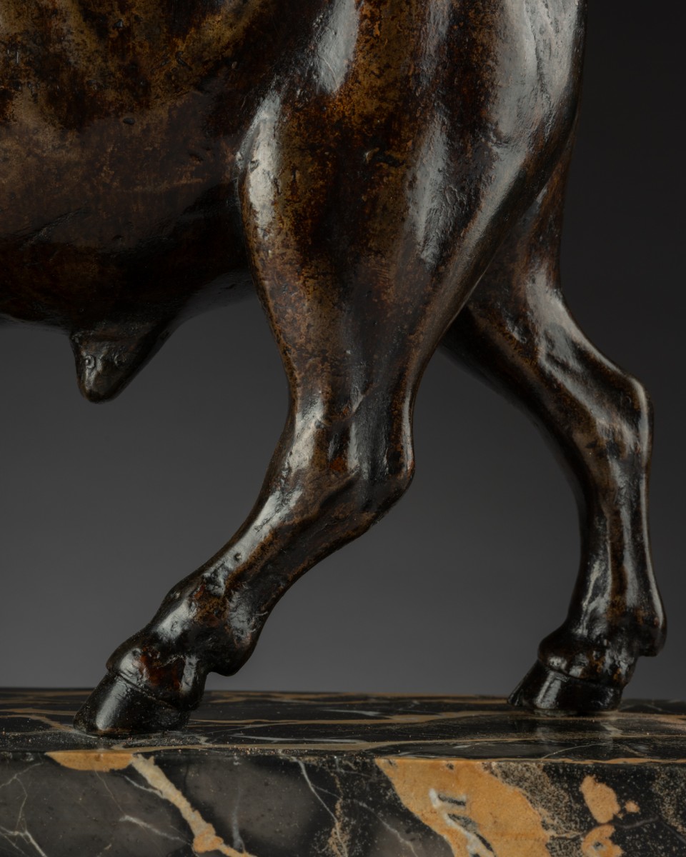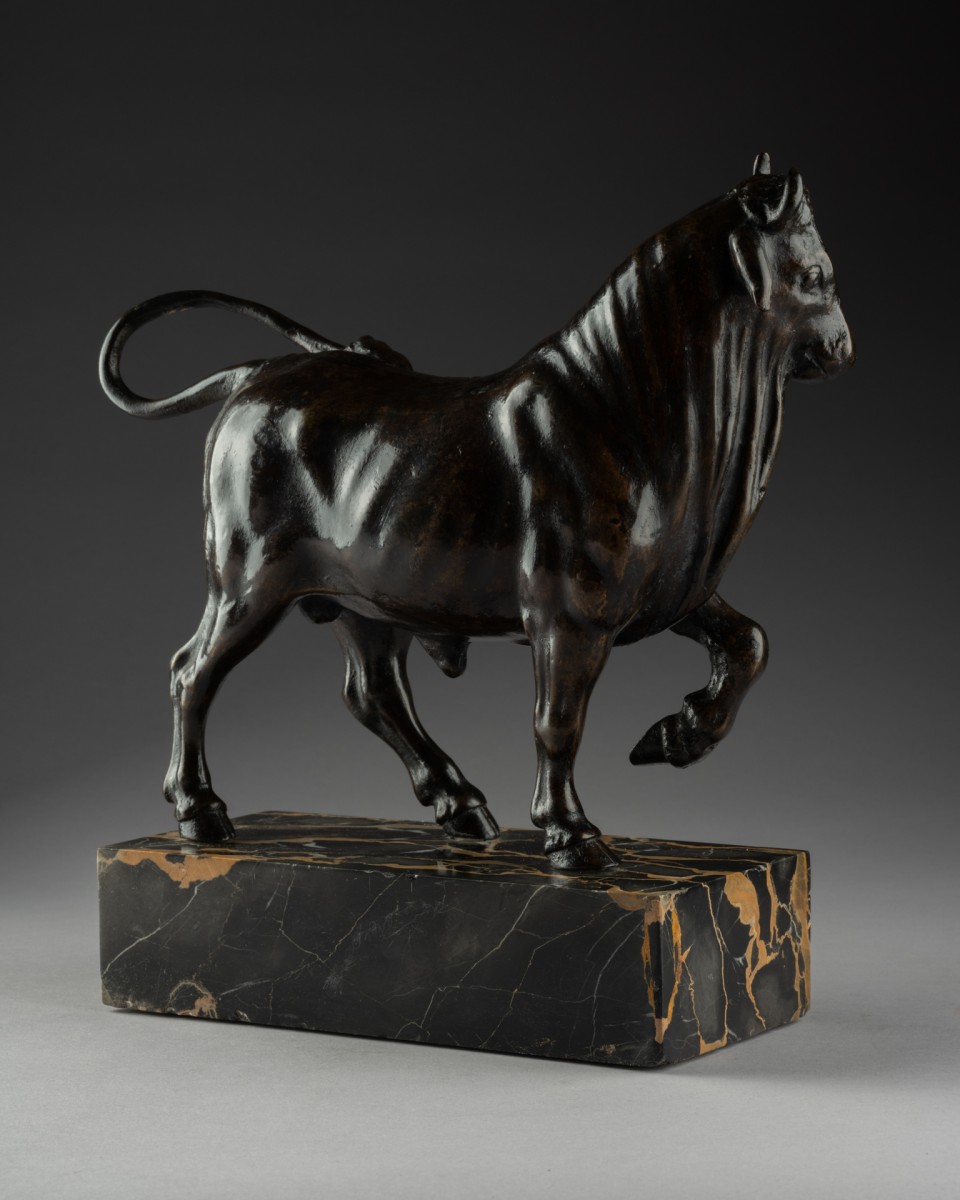 This fine 17th century bronze statuette depicting a bull is based on an original by the great Florentine sculptor of Flemish origin, Giambologna (1529-1608). Giambologna based his bull on ancient Roman statues and other depictions of the sacrificial animal. Together with a series of other statues by the artist, it exemplifies the influence of the Antique on his oeuvre. Originally Giambologna seems to have invented the statue of The Bull to pair it with an earlier statue he had made of a Lion, itself based on Roman sculptures and images of lions. While Giambologna produced the wax master-model of the statue, it was his talented and renowned pupil Antonio Susini (1580-1624) who created the moulds necessary for casting an edition. Eventually two slightly different models of the Bull were made. The rarer type is heavier build, with a more pronounced dewlap and more extensive tufts of curls hanging down its forehead. This is the type that can be found in the Bargello in Florence. The second, much commoner type has a smoother neck and a slightly smaller head, which is held slightly more erect. It was successively cast by Antonio and Gianfrancesco Susini. Soon, this latter type is often found paired with the statue of a Horse, also by Giambologna. This pairing became far more popular and frequent than its original pairing with the Lion and seems to have become standard early on.