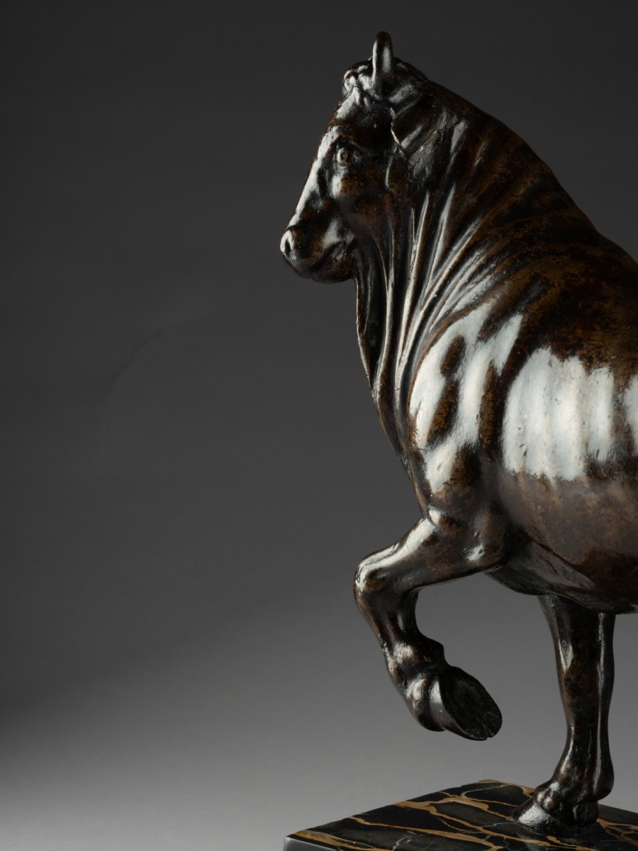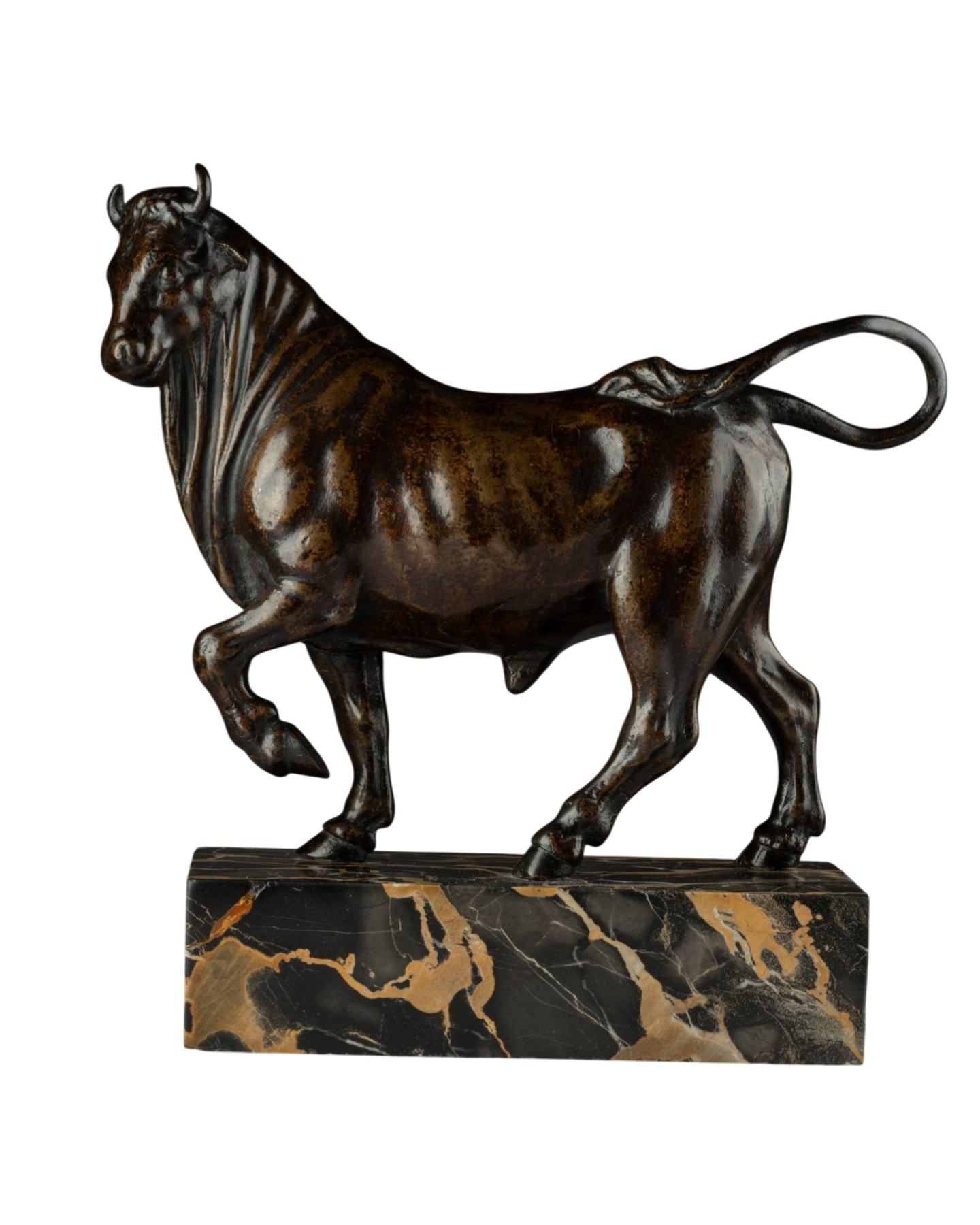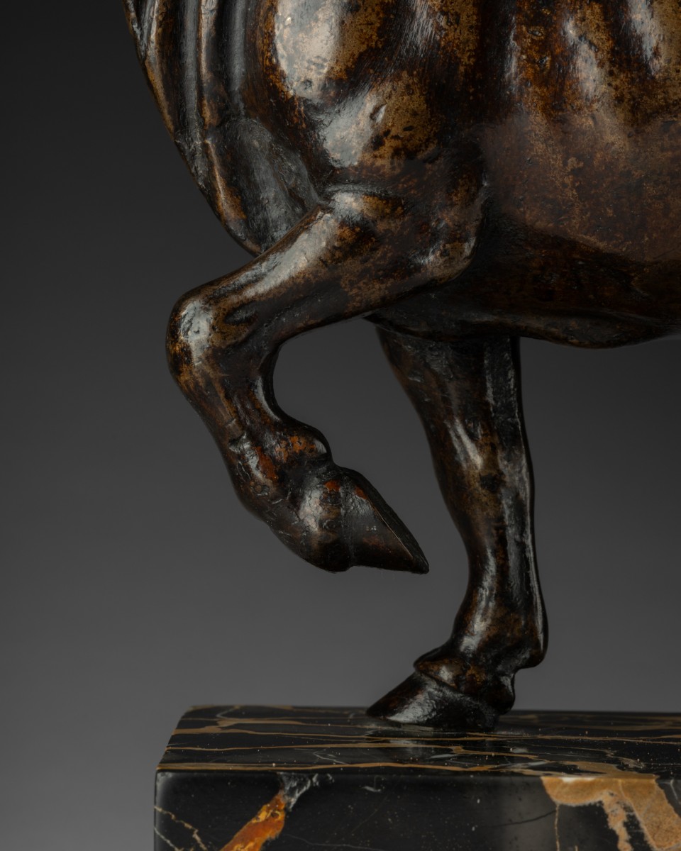 This fine 17th century bronze statuette depicting a bull is based on an original by the great Florentine sculptor of Flemish origin, Giambologna (1529-1608). Giambologna based his bull on ancient Roman statues and other depictions of the sacrificial animal. Together with a series of other statues by the artist, it exemplifies the influence of the Antique on his oeuvre. Originally Giambologna seems to have invented the statue of The Bull to pair it with an earlier statue he had made of a Lion, itself based on Roman sculptures and images of lions. While Giambologna produced the wax master-model of the statue, it was his talented and renowned pupil Antonio Susini (1580-1624) who created the moulds necessary for casting an edition. Eventually two slightly different models of the Bull were made. The rarer type is heavier build, with a more pronounced dewlap and more extensive tufts of curls hanging down its forehead. This is the type that can be found in the Bargello in Florence. The second, much commoner type has a smoother neck and a slightly smaller head, which is held slightly more erect. It was successively cast by Antonio and Gianfrancesco Susini. Soon, this latter type is often found paired with the statue of a Horse, also by Giambologna. This pairing became far more popular and frequent than its original pairing with the Lion and seems to have become standard early on.