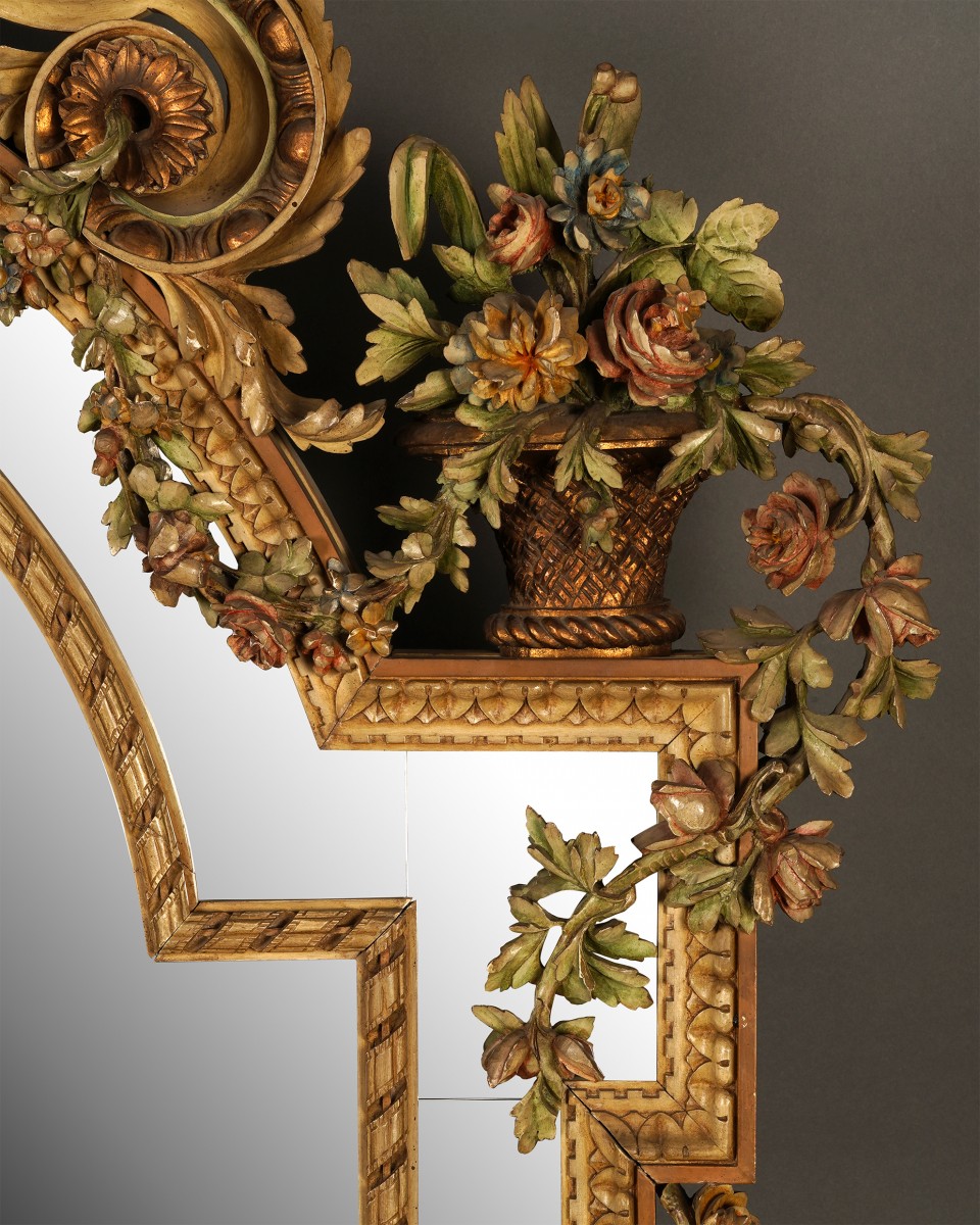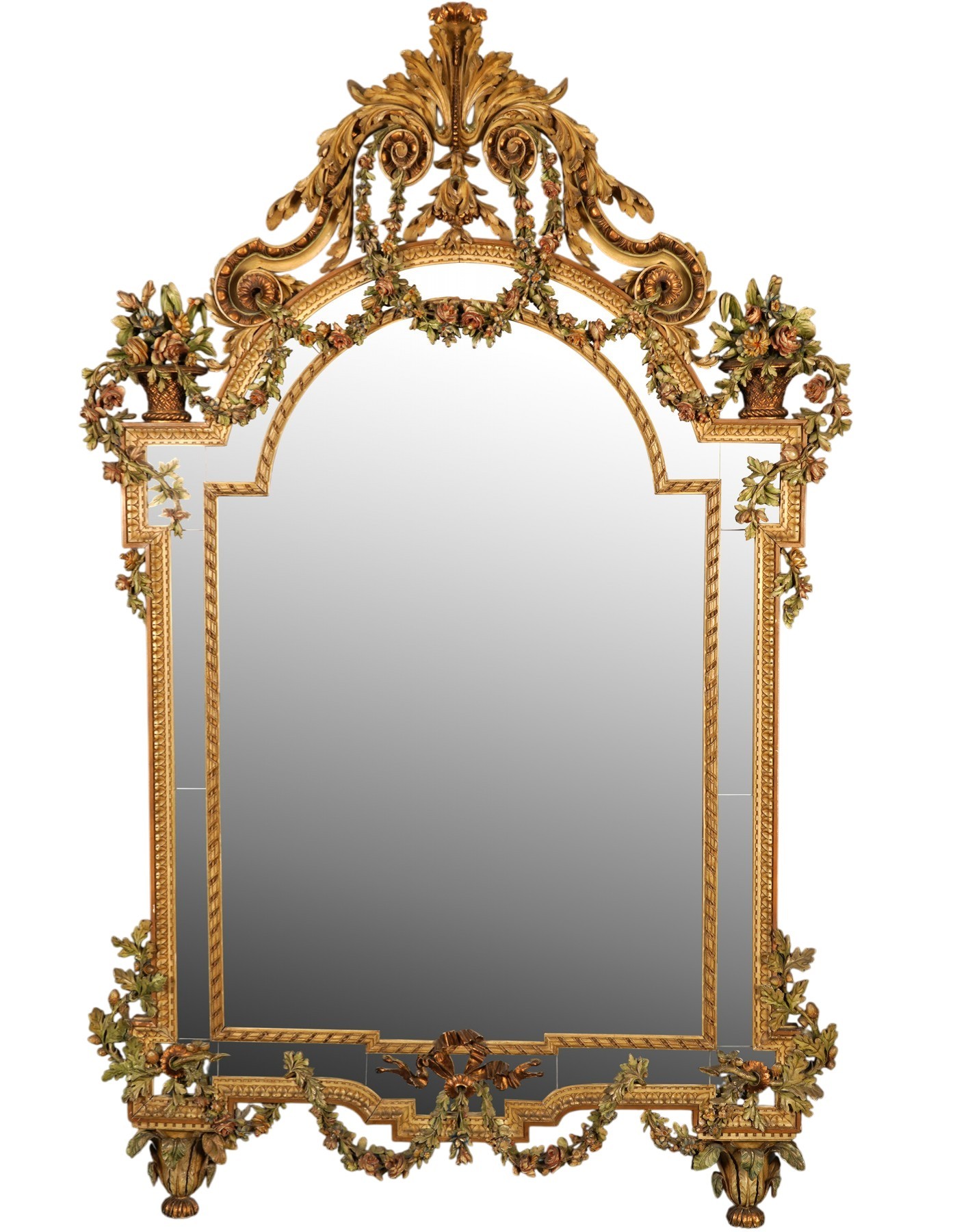 The richly carved frame is adorned with an abundant décor of foliage, flowers, and scrolling motifs, executed in relief and enhanced with polychromy in natural tones (greens, pinks, and ochres) elegantly contrasting with the gilded elements. The openwork crest at the top features an important motif of symmetrical leafy volutes framing a slender central ornament that accentuates the overall verticality of the piece. The finely molded lateral and upper glazing bars structure the main mirror and amplify the reflection of light, while reinforcing the monumentality of the composition. The base of the frame is decorated with a carved floral garland, embellished with cascading flowers and foliage, resting on small sculpted feet that lend both stability and elegance.