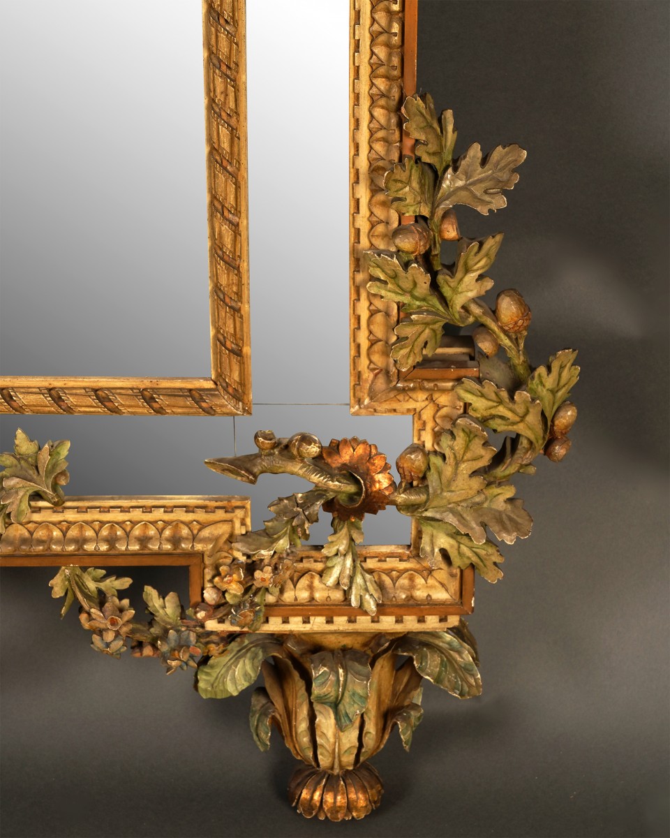 This large mirror with carved and polychrome wooden glazing bars stands out for its highly architectural and decorative composition, inspired by the Baroque and Rococo styles, which were particularly appreciated in Italy during this period.