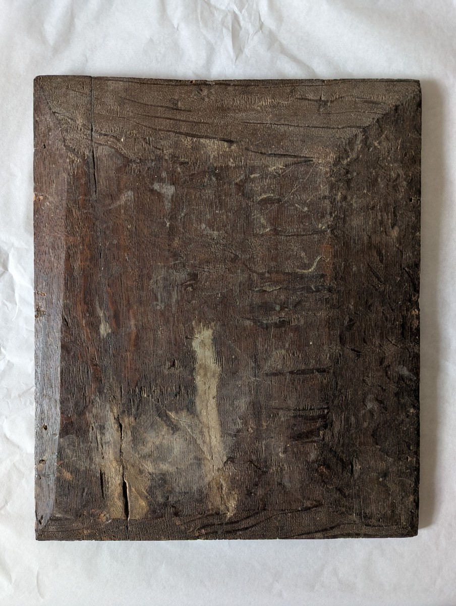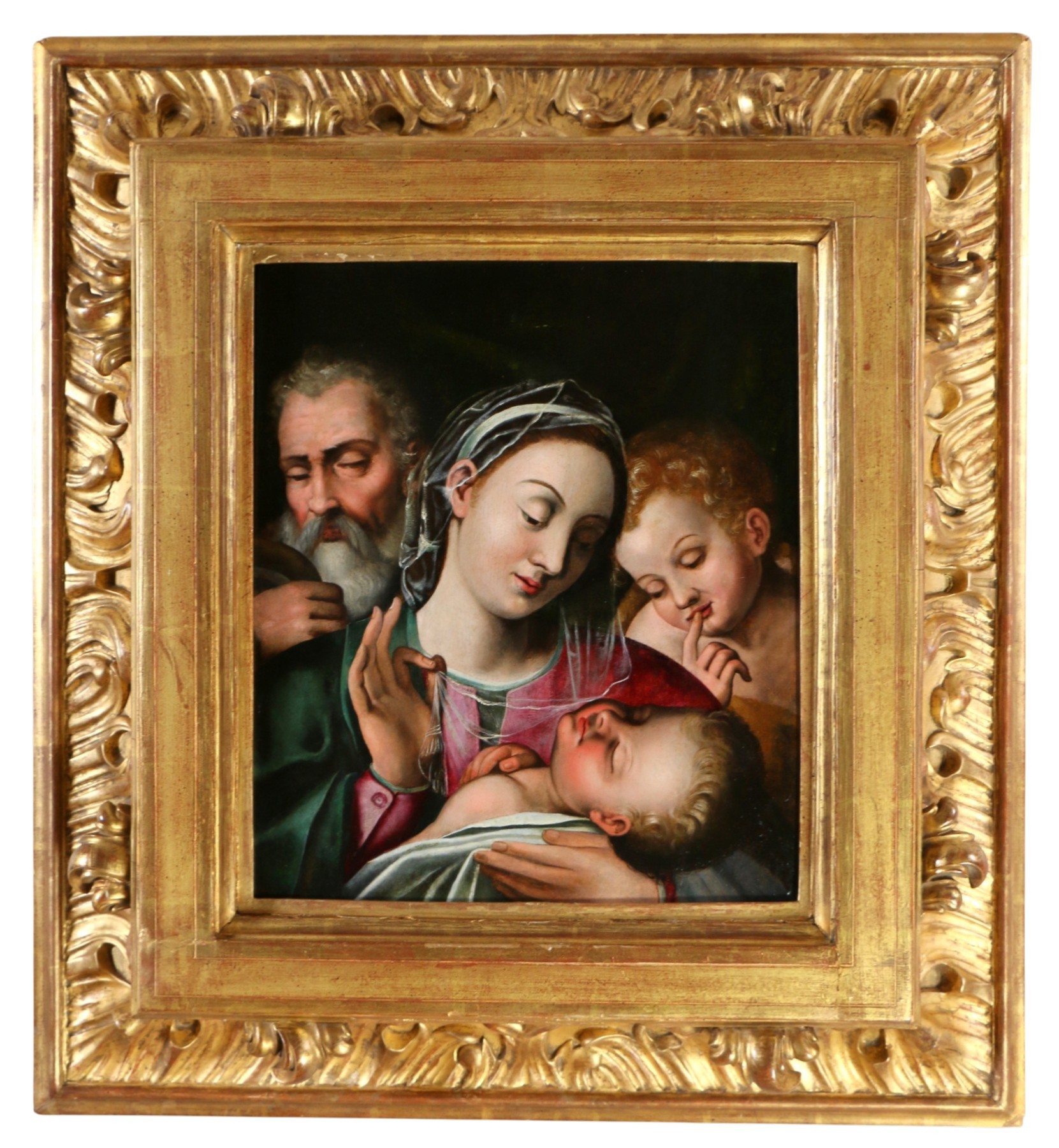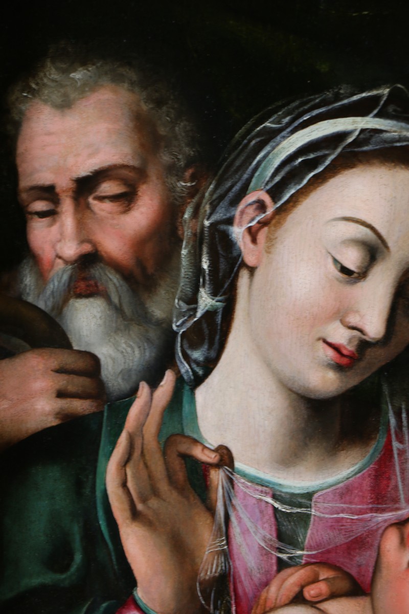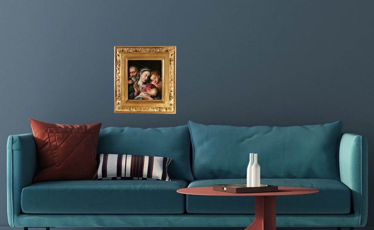 This superb painting, enhanced by a sumptuous frame, presents a Holy Family with the young Saint John the Baptist, a theme particularly prevalent in Italian painting of the first half of the 16th century. The composition shows the Virgin seated, holding the Infant Jesus on her lap, accompanied by Saint Joseph, positioned slightly behind, while the young Saint John stands nearby in a devotional pose. The whole is organized according to a simple and balanced pyramidal structure, inherited from High Renaissance models. The scene is characterized by an intimate and contemplative atmosphere. The faces have regular, oval features with lowered eyelids, giving them a gentle and meditative expression. The modeling of the flesh tones is blended, with subtle transitions between shadow and light. The drapery, rendered with fluidity, and the palette contribute to the overall warm harmony. The technique is oil on wood panel, probably poplar, a support frequently used in Emilia-Romagna during the 16th century. The paint layer displays a network of fine, regular craquelure, indicative of its age. Stylistically, the work clearly belongs to the Emilian tradition, influenced by the circle of Raphael. It shows notable affinities with the work of the Ramenghi family.