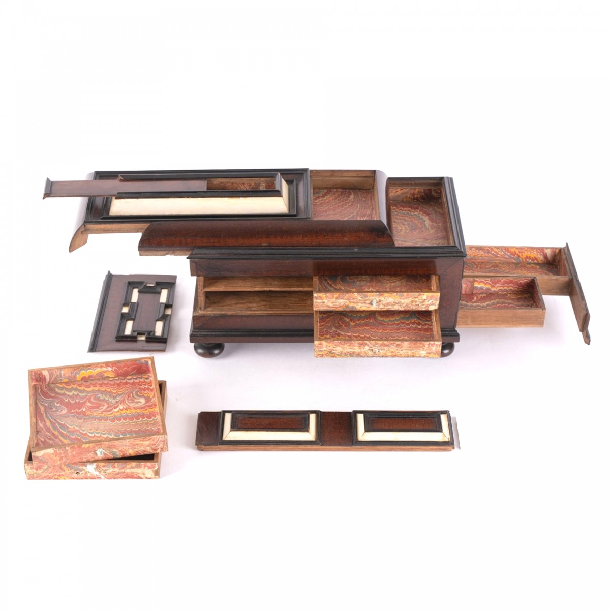 One secret drawer. All lined with its original marble-paper.
