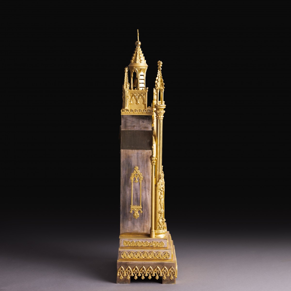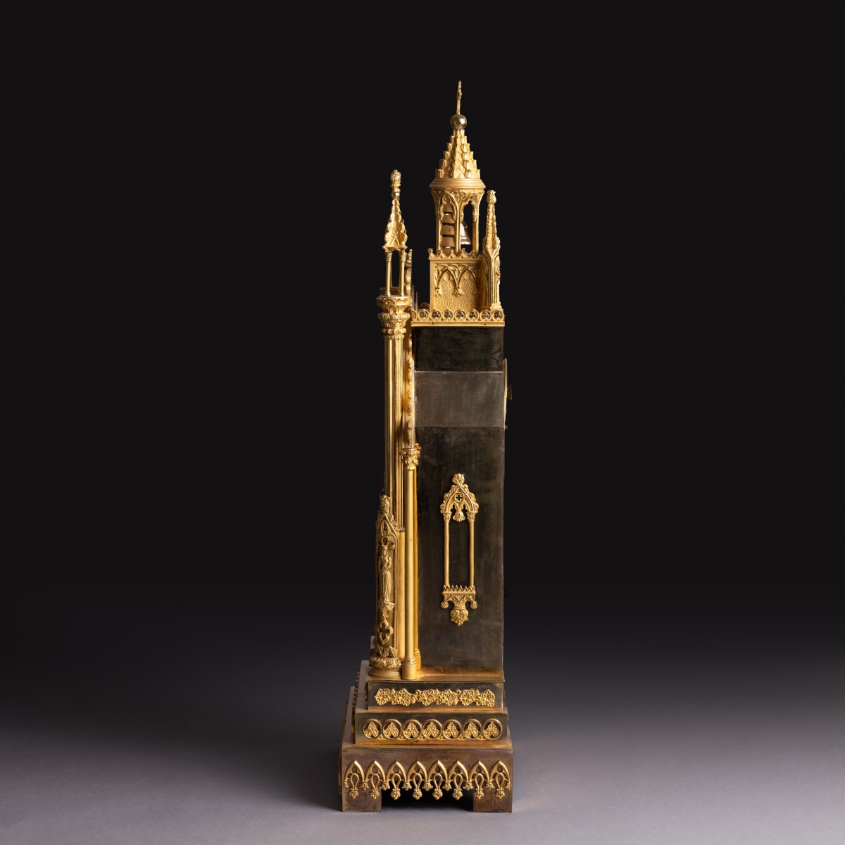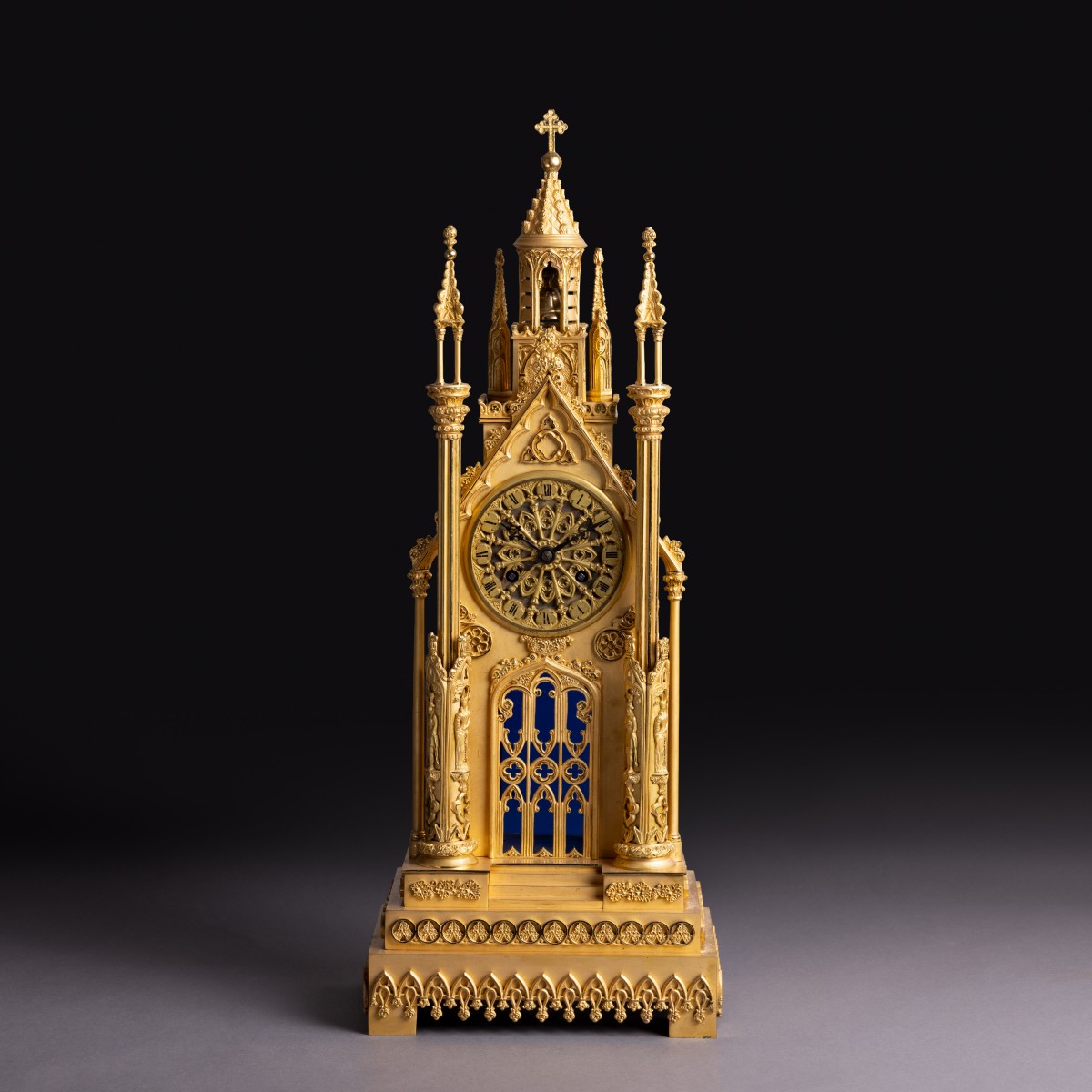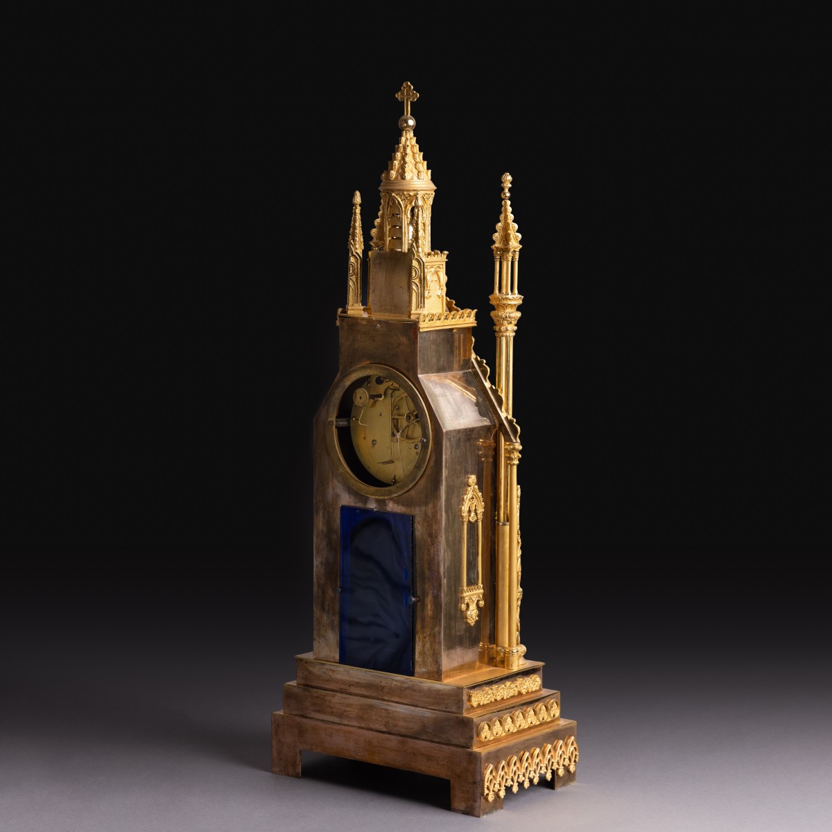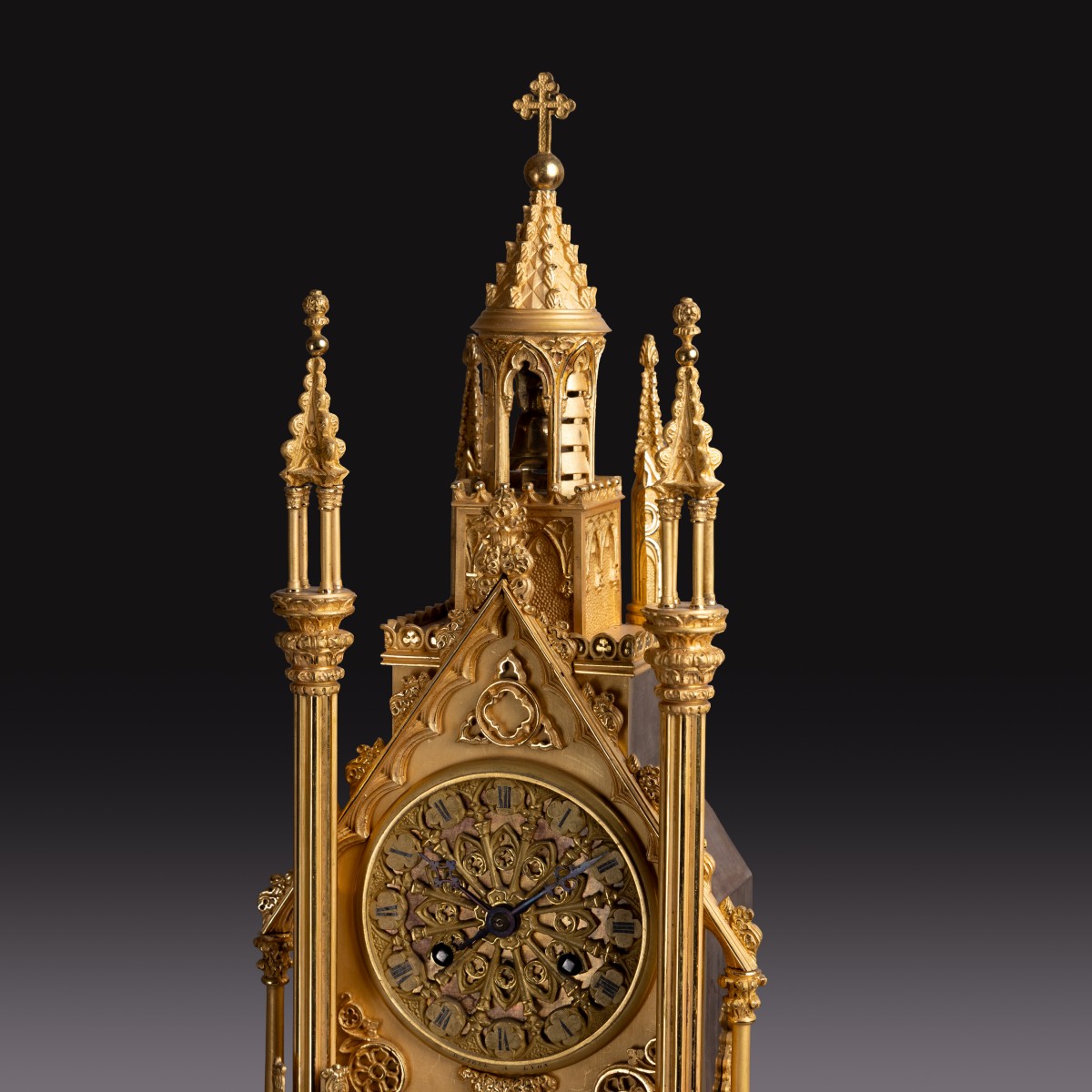 Large architectural clock. It rests on a quadrangular base with three tiers. The central body is framed by flying buttresses and small columns with pinnacles. The dial with “Gothic” numerals is an integral part of this idealized cathedral facade. These models were very successful, as evidenced by the many silver, green, and brown patina variants. Raingo signed a number of them, which could possibly indicate that he produced the bronze elements himself...