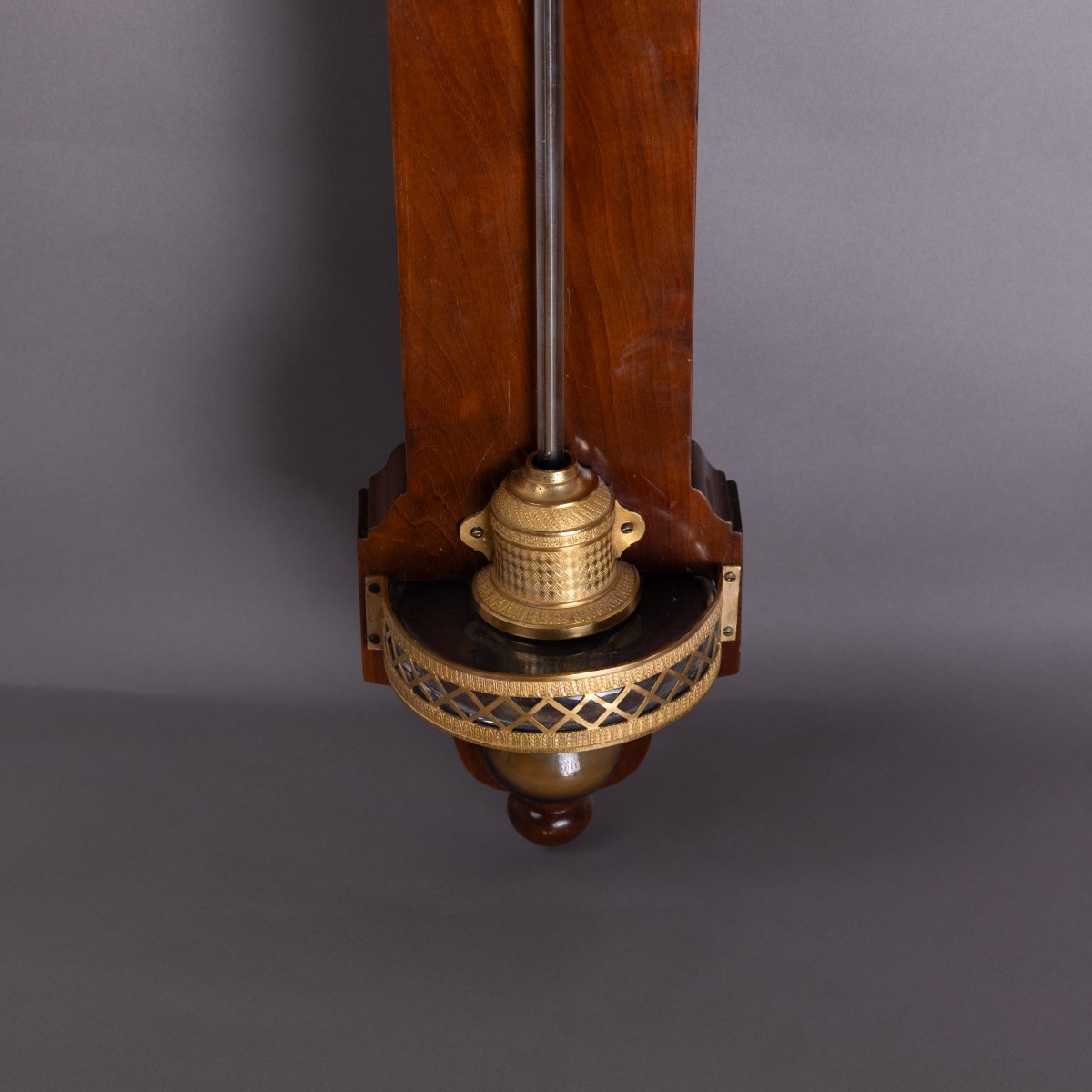 Large mercury barometer, based on Torricelli's design. Slender in shape, made of flamed mahogany, it is decorated with gilded bronze friezes, knurled and openwork in the lower part. The calibrated brass plate is engraved with the company name “Haring./Optician to His Majesty the King of Württemberg/Royal Palace No. 63.”