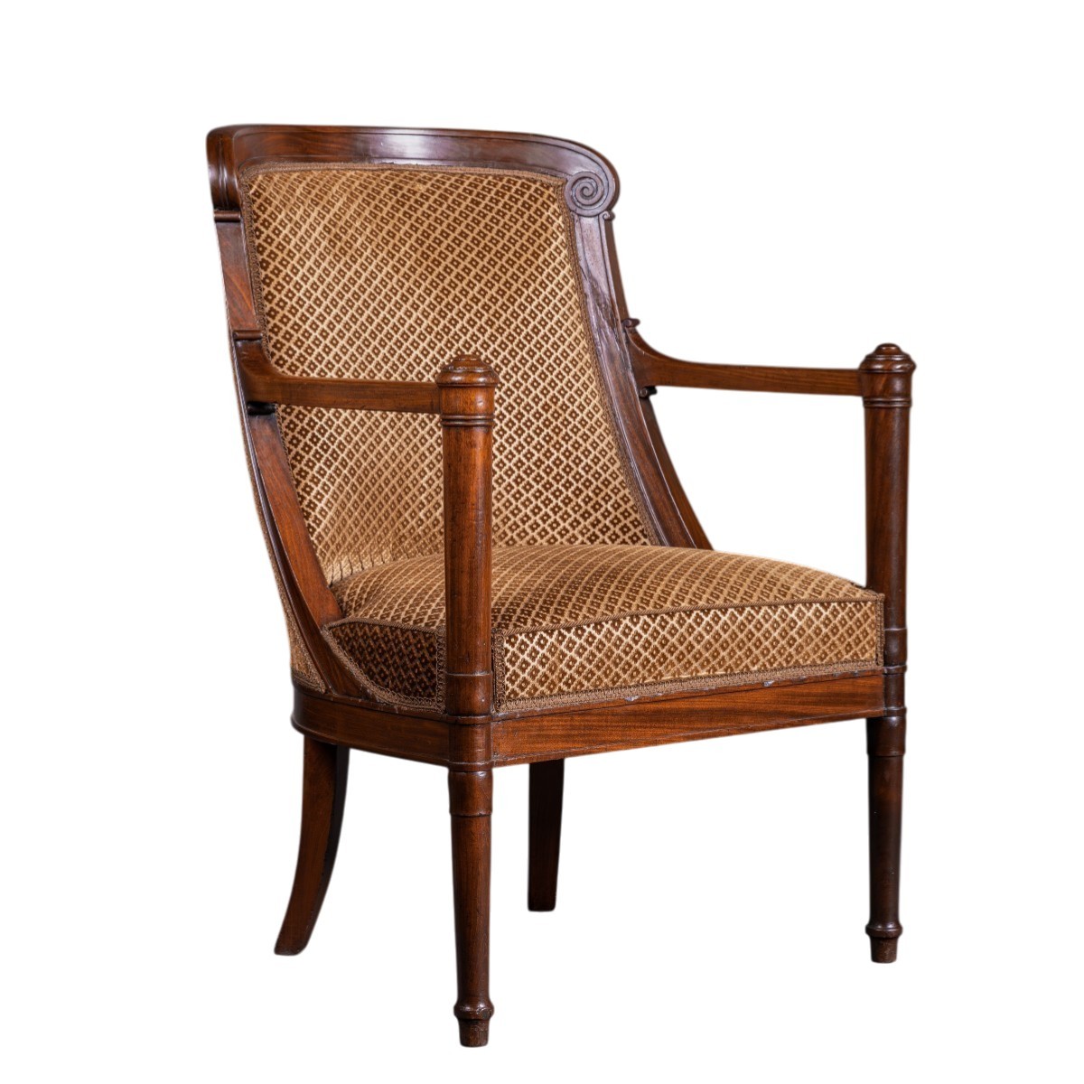 An impressive gondola-shaped armchair, it rests on tapered front legs with rings and sabre-shaped rear legs. Simply molded belt. The armrest supports extend from the legs, in a quiver shape, and the strongly curved backrest is decorated with scrolls topped with leaves.