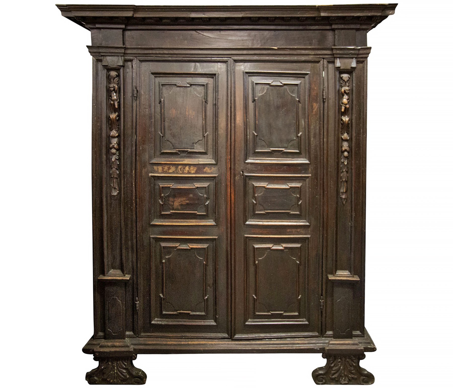 Walnut wardrobe, Lombardy, 17th century, front with two doors decorated with panels within mixtilinear frames, pilasters on the sides decorated with cascades of leaves, slightly projecting moulded cymatium and carved corbel front panels, 222x197x81 cm