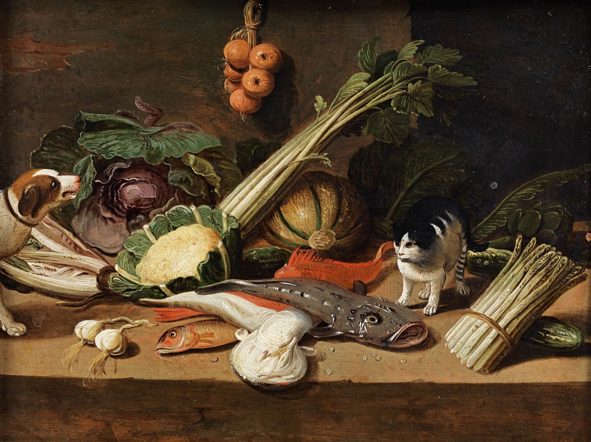 A Kitchen Still Life with a Dog and a Cat and a Bunch of Asparagus