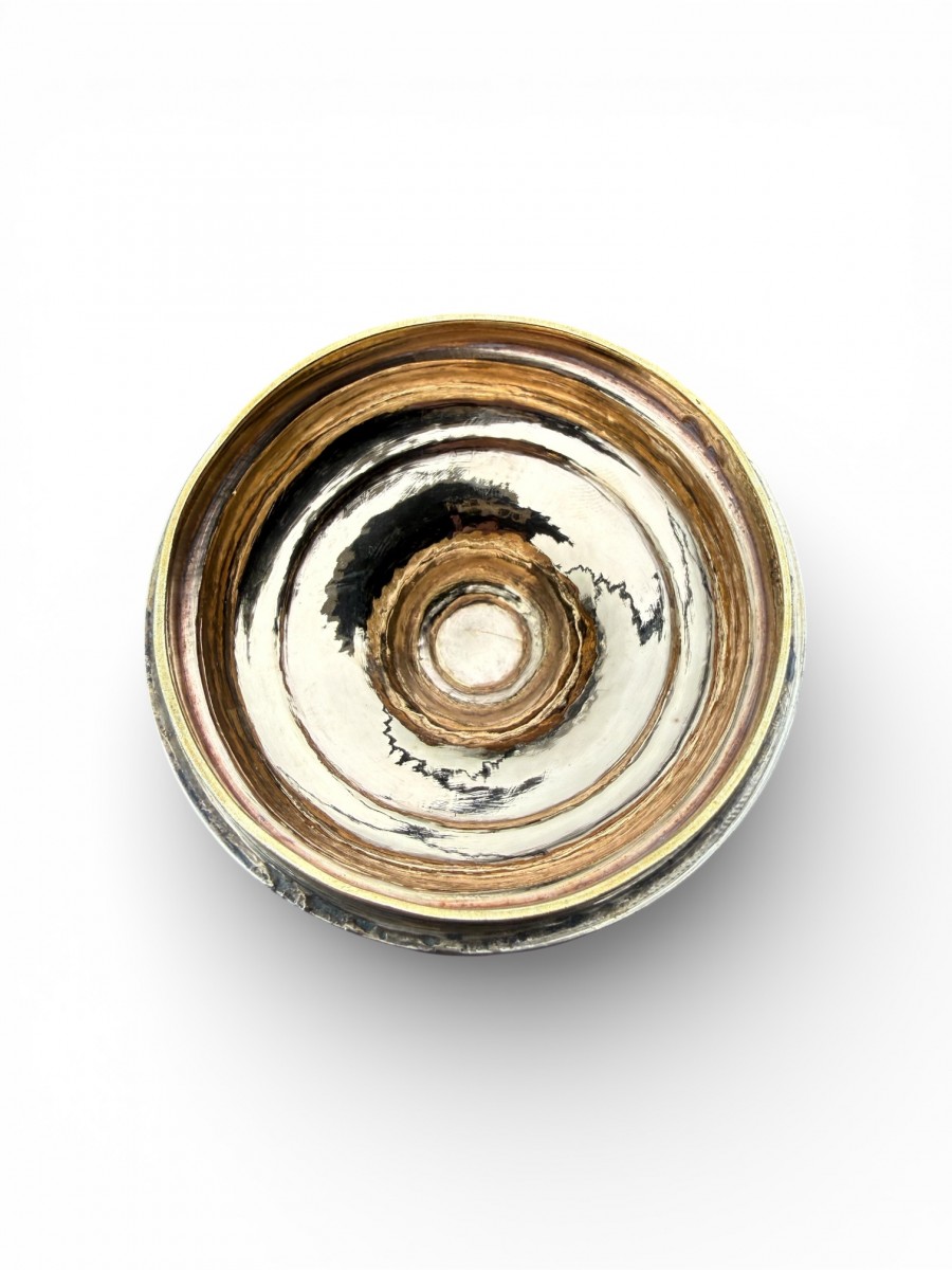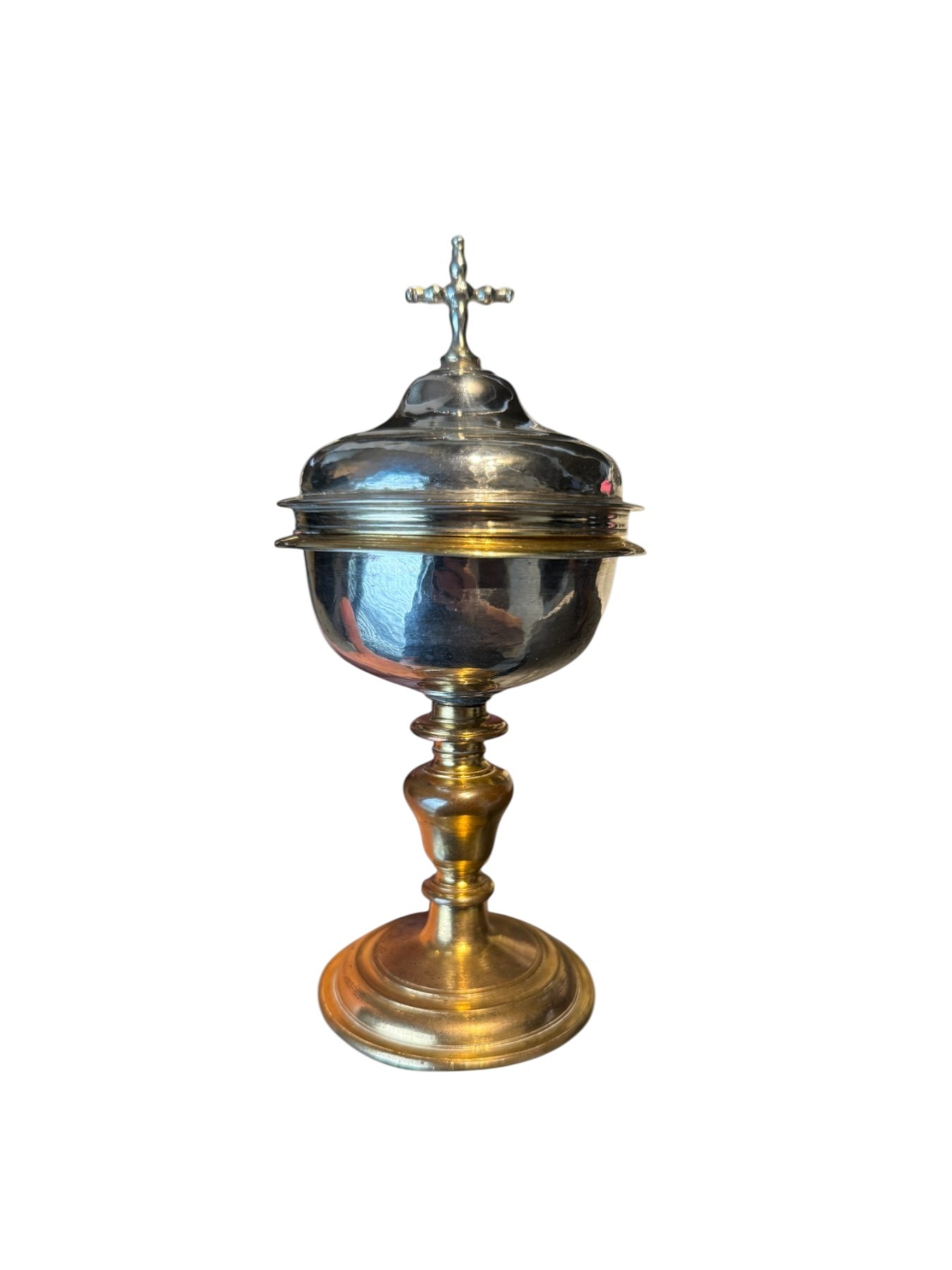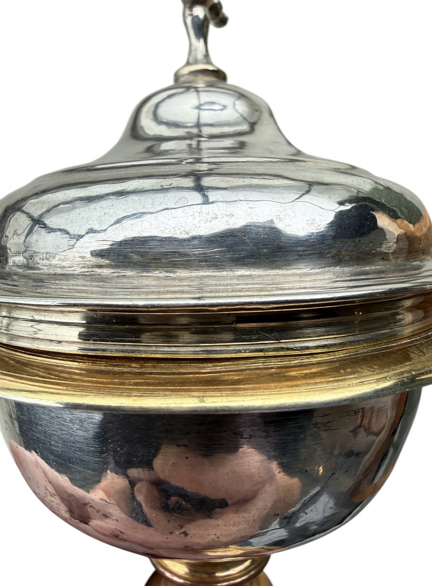 The hemispherical cup is fitted with a domed lid surmounted by a cross finial. The baluster-shaped gilt copper stem and foot display a beautiful aged patina, reflecting its authenticity and liturgical use. The contrast between the restrained brilliance of the silver and the warm tones of the gilt copper enhances the aesthetic harmony of the piece.