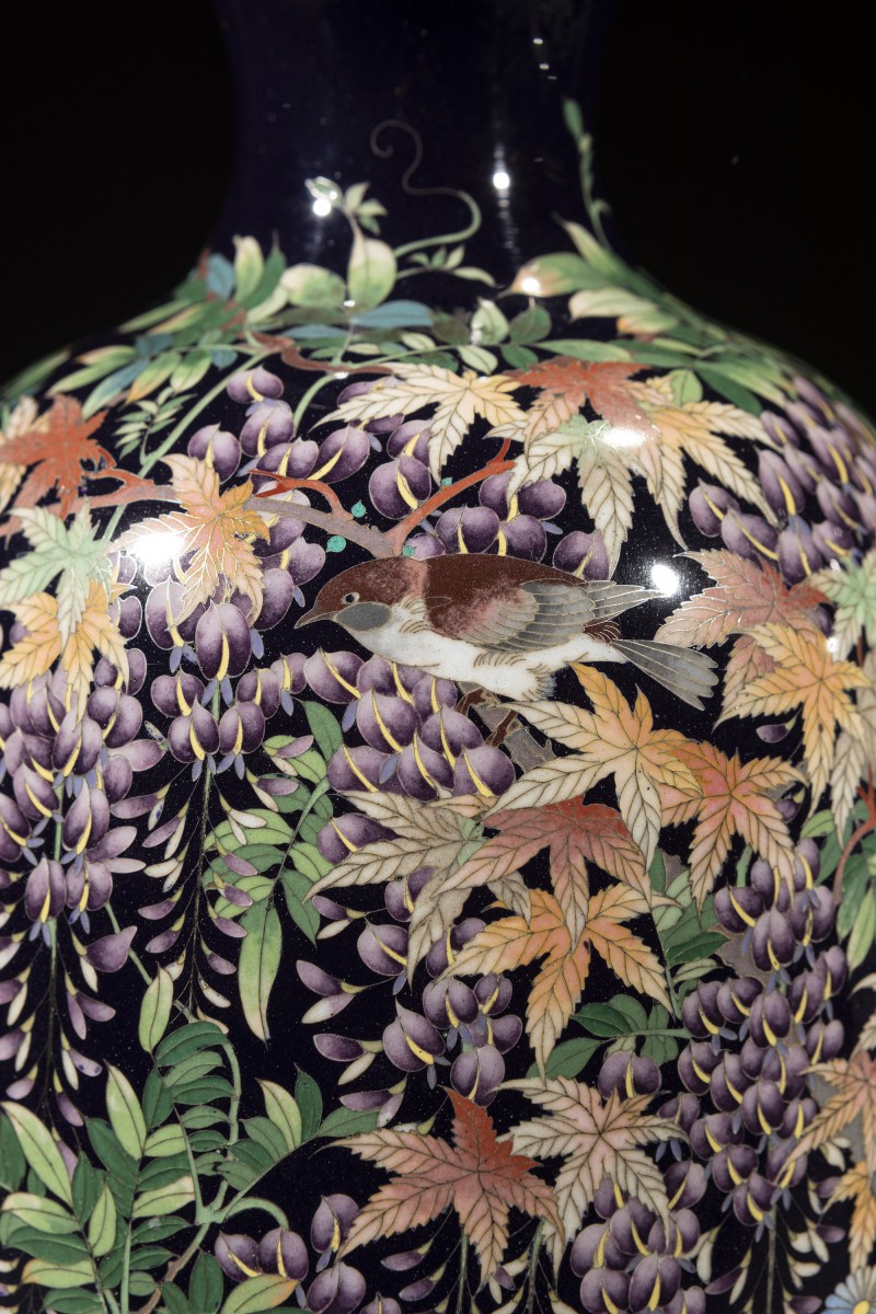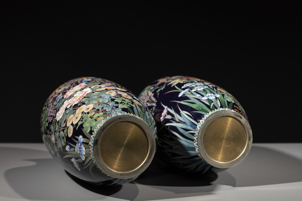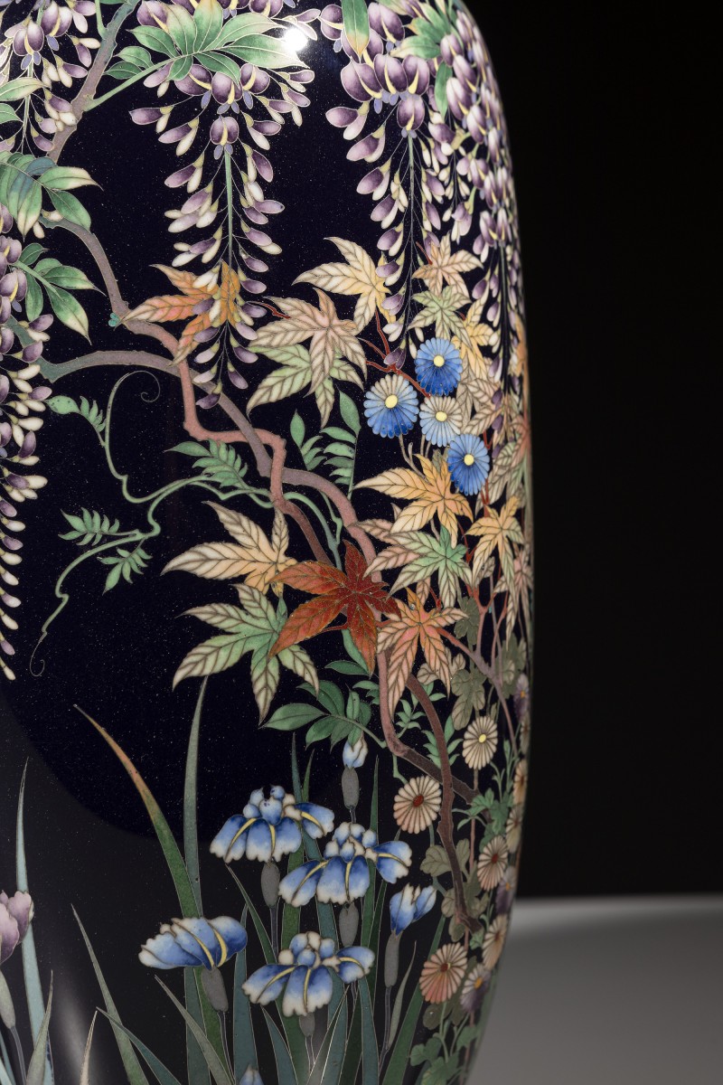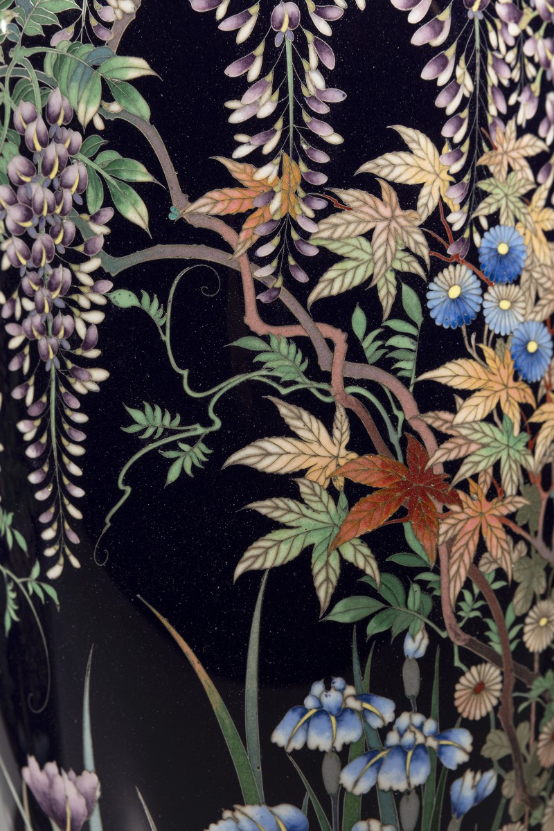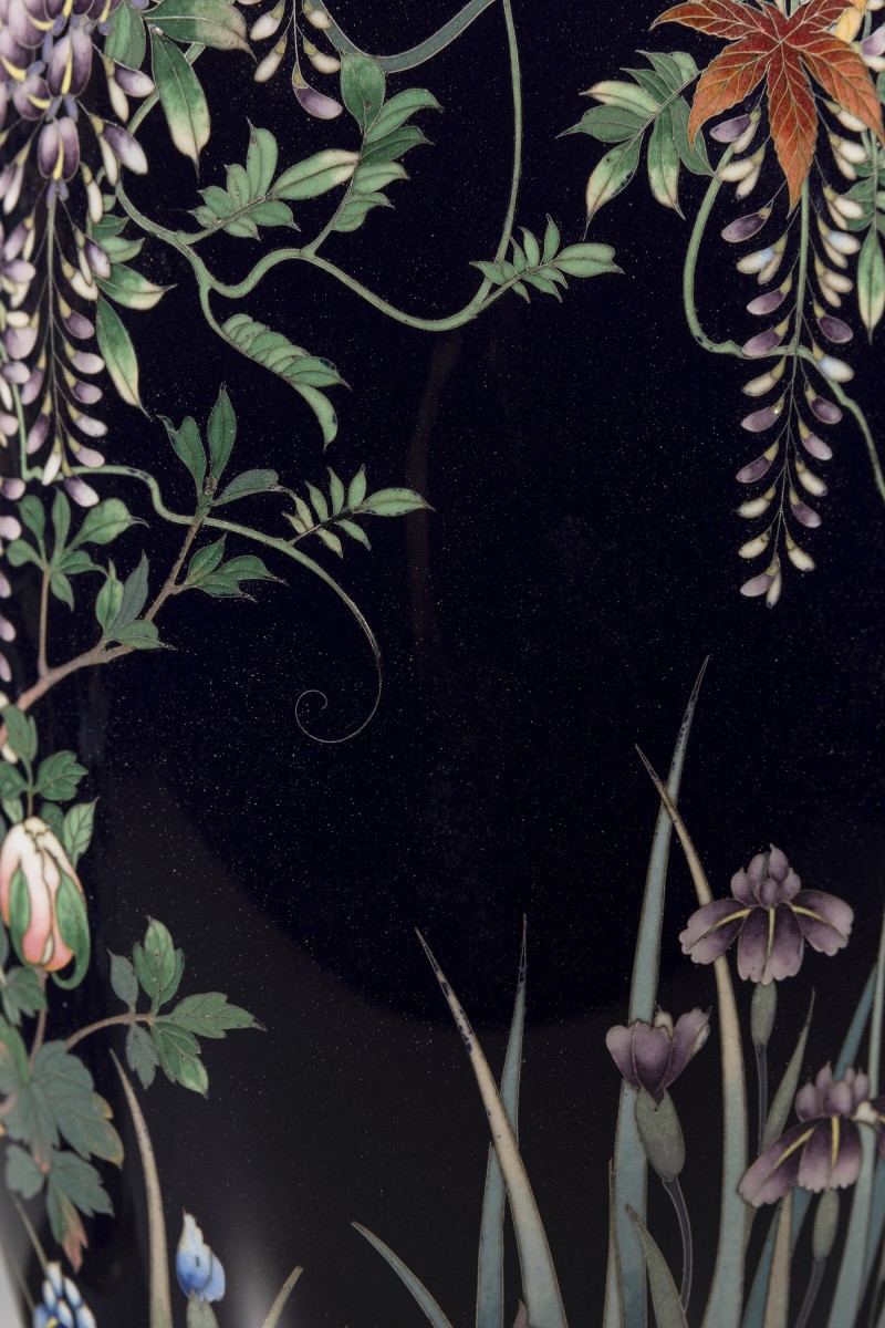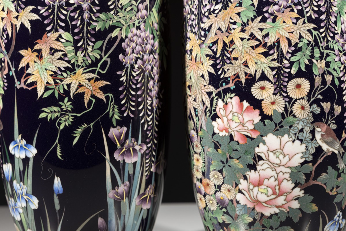 A pair of cloisonné vases decorated with polychrome enamels and silver wire on a deep blue ground, depicting a flower garden rendered with refined chromatic subtlety. The decoration interweaves chrysanthemums, cascading clusters of wisteria, irises, maple leaves, and blooming peonies. The composition, balanced and continuous across the two vases, enhances the contrast between the dark ground and the vividly colored naturalistic motifs.