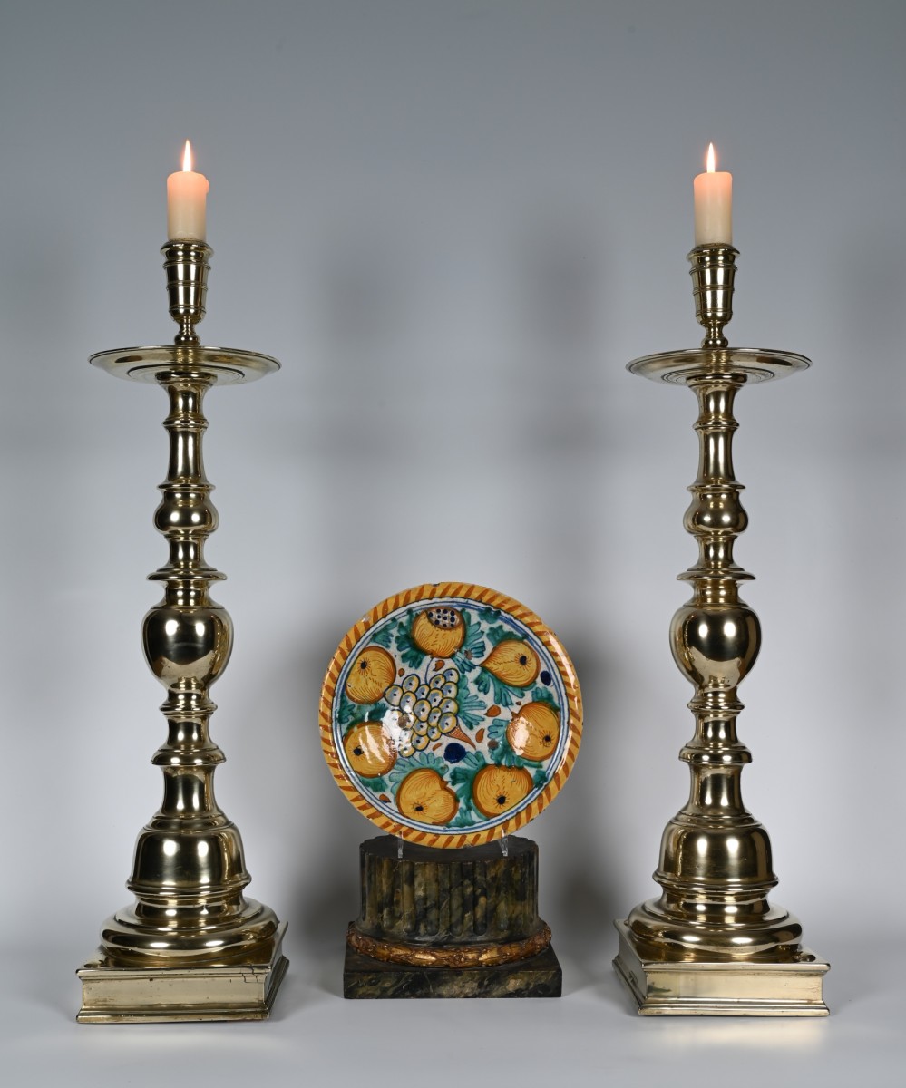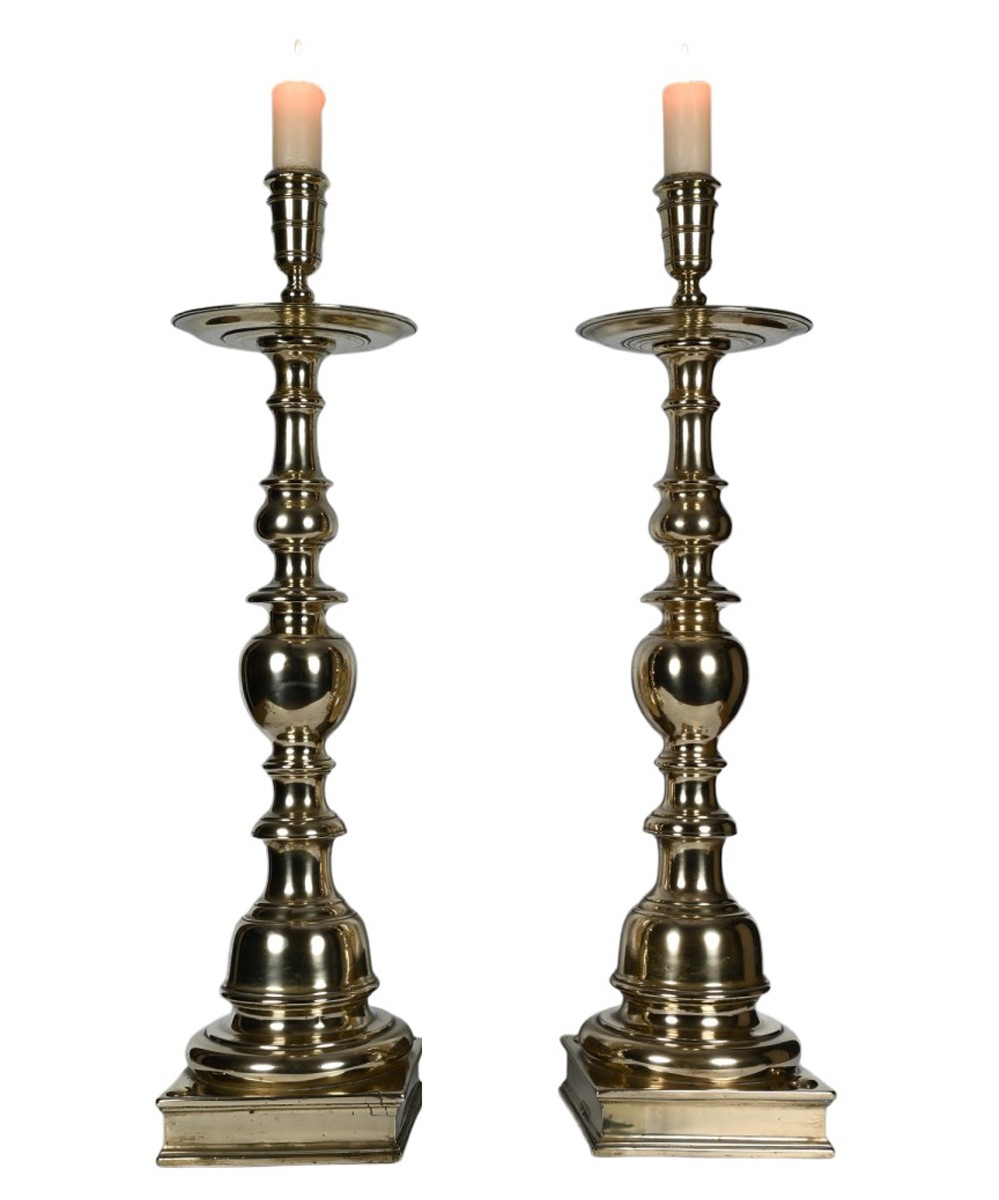 A rare pair of large brass candlesticks, this model of candlestick was made for use in synagogues, which is why they are rarely found in the antiques trade.