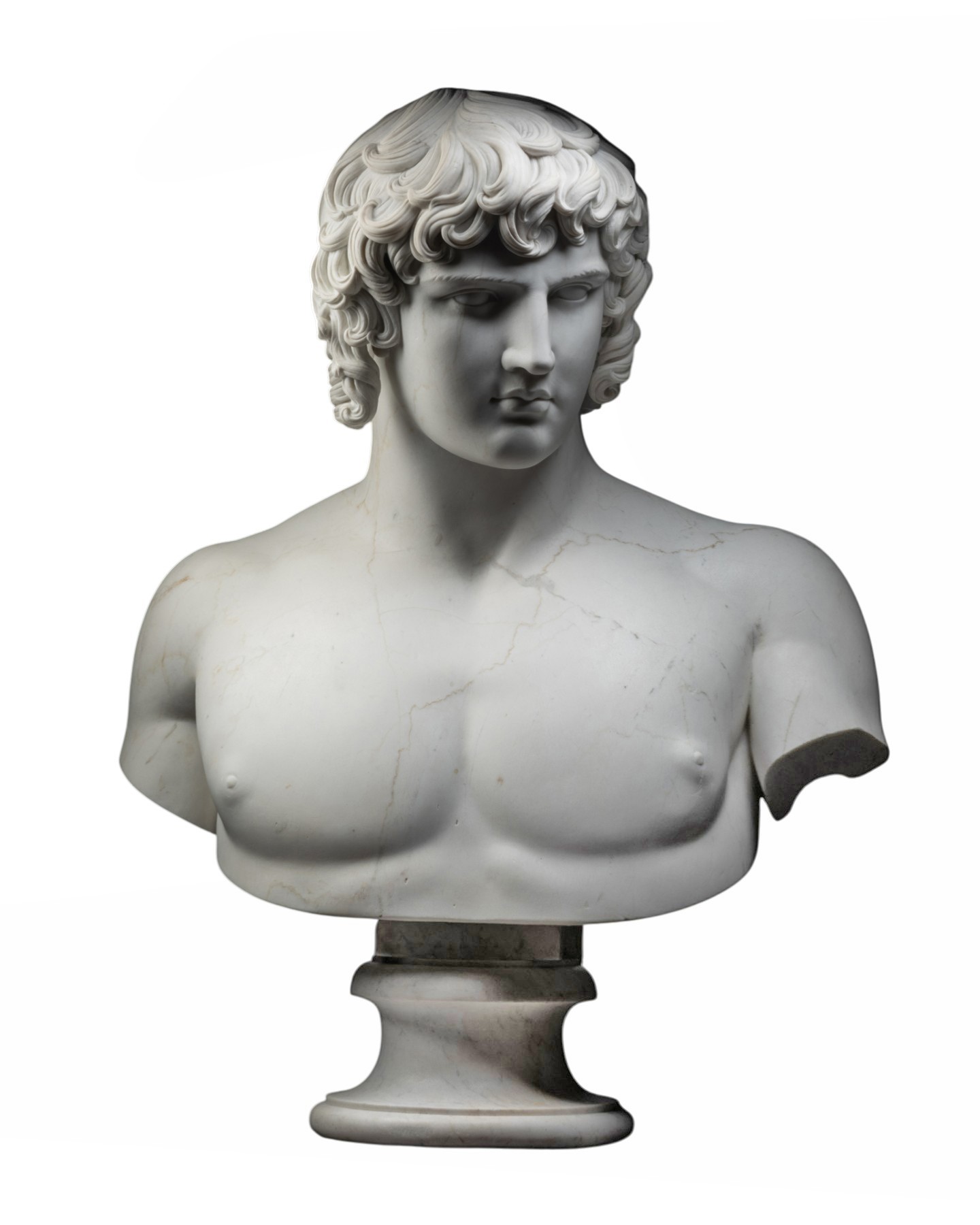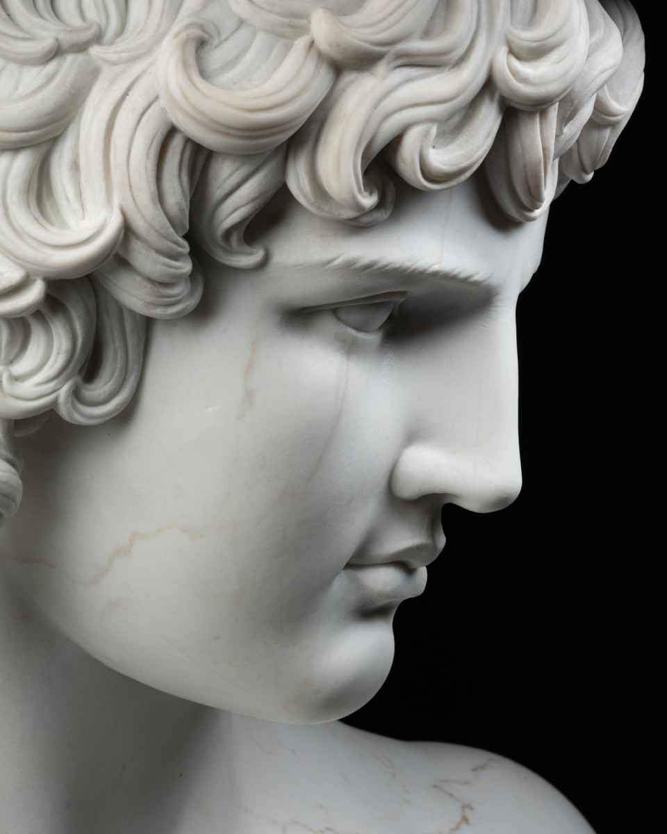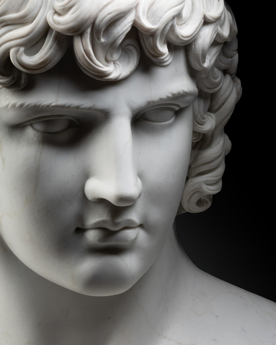 The present marble bust is a compelling and refined Roman neoclassical representation of the youth, traditionally identified as Antinous. It is sculpted from fine carrara marble. It presents a slender, ephebic male figure with gently modelled facial features and a soft yet penetrating gaze.