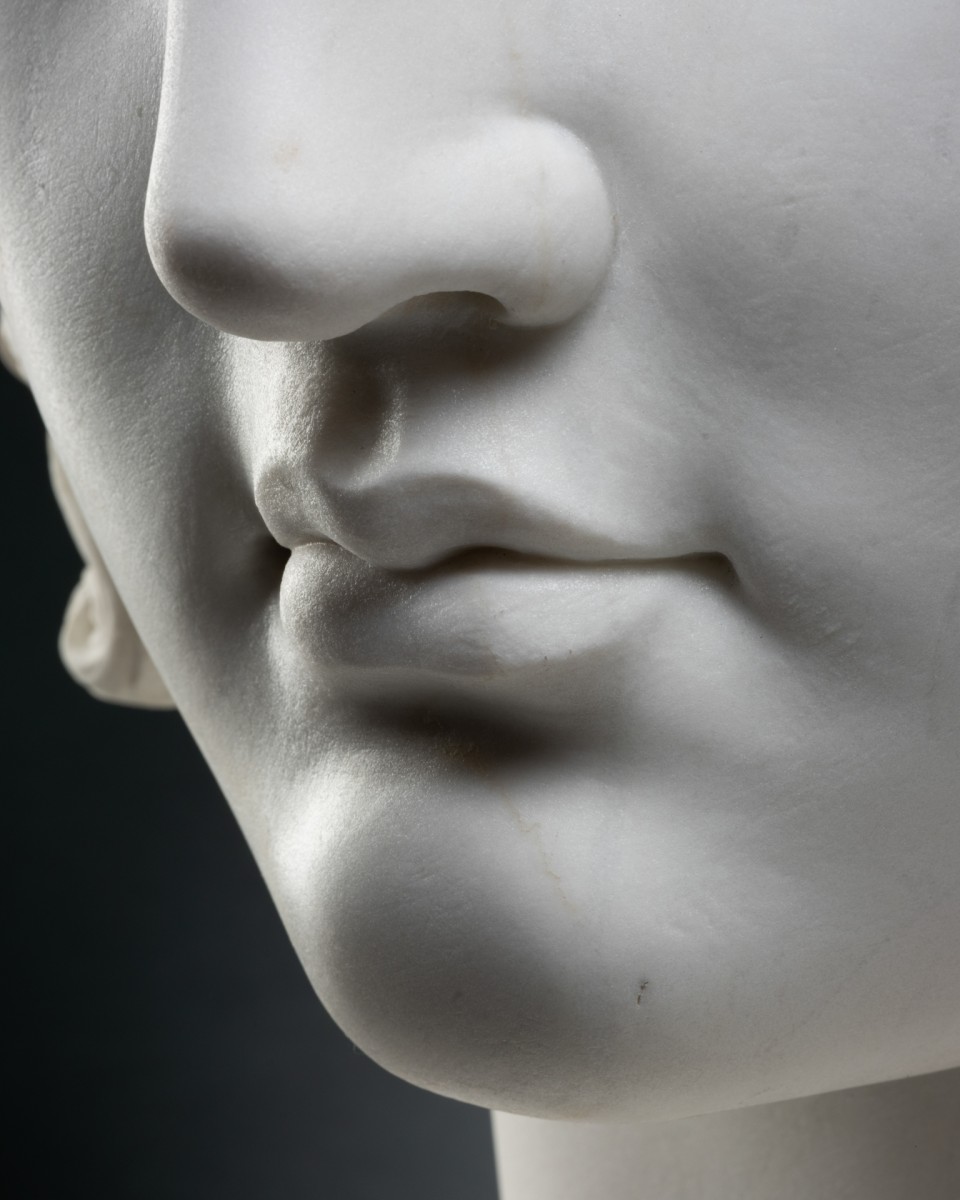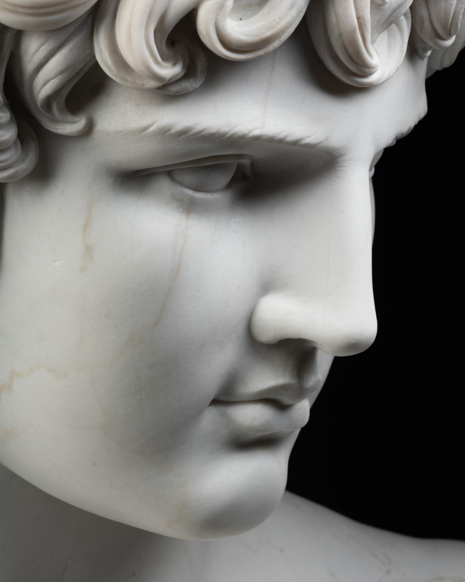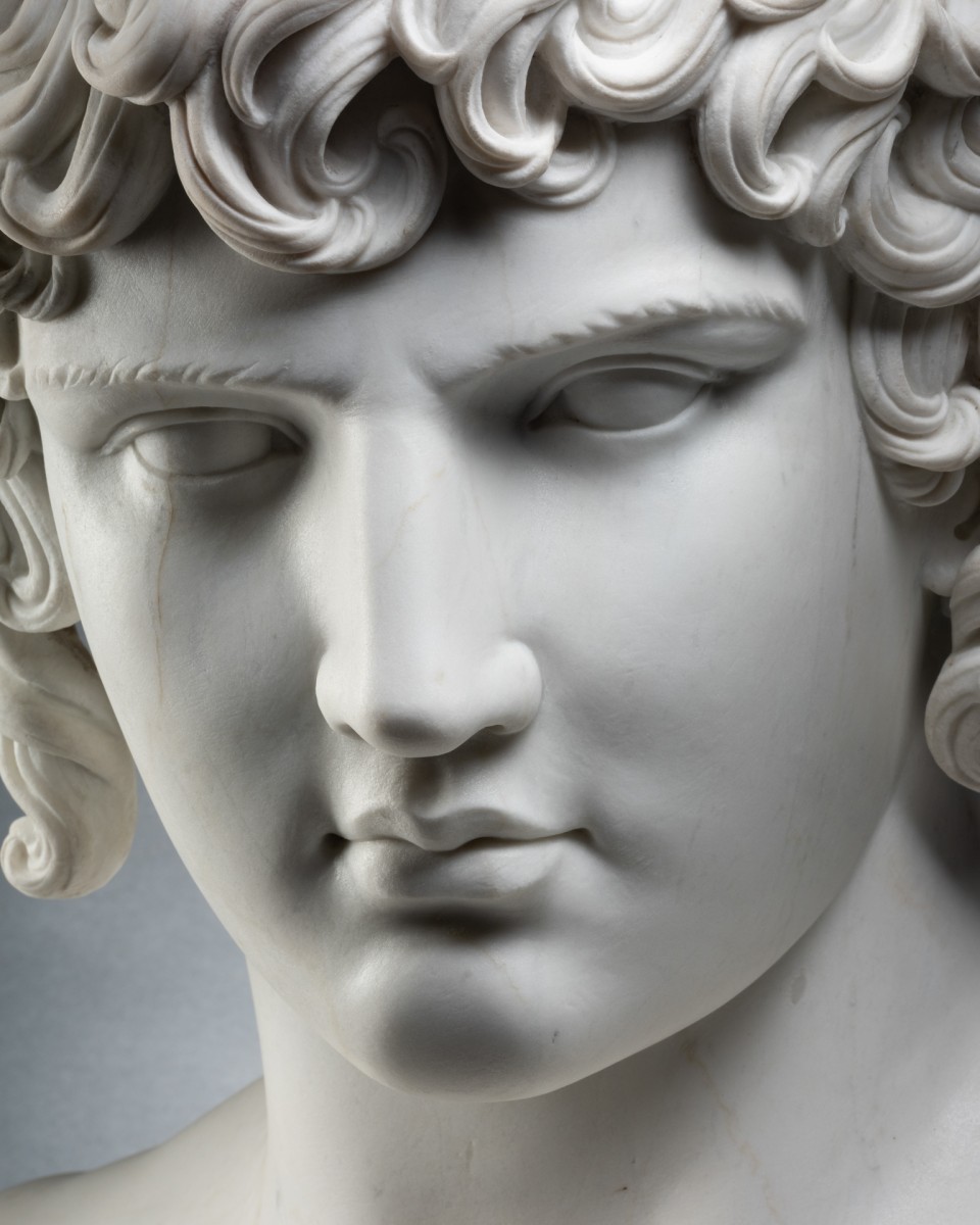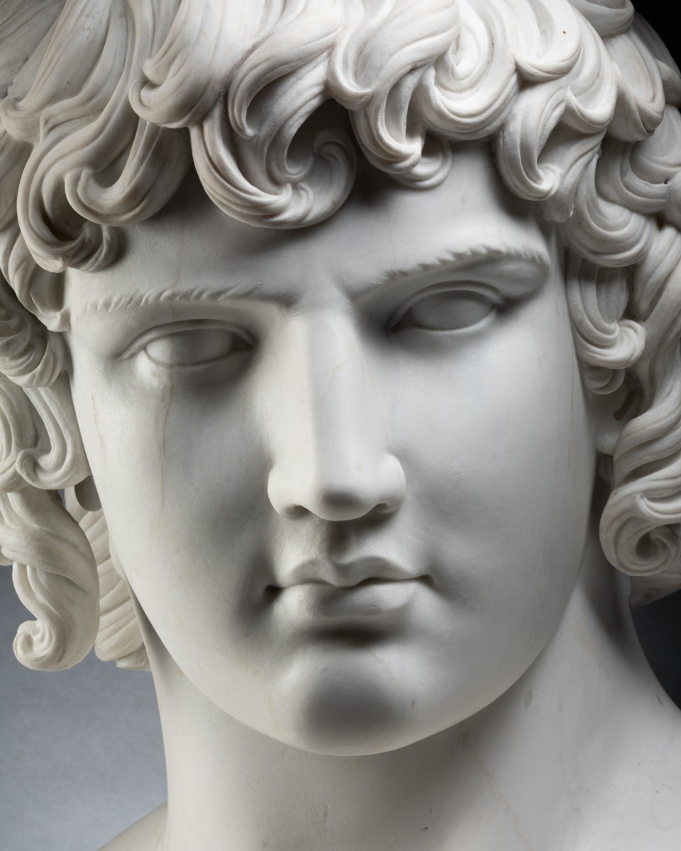 The present marble bust is a compelling and refined Roman neoclassical representation of the youth, traditionally identified as Antinous. It is sculpted from fine carrara marble. It presents a slender, ephebic male figure with gently modelled facial features and a soft yet penetrating gaze.