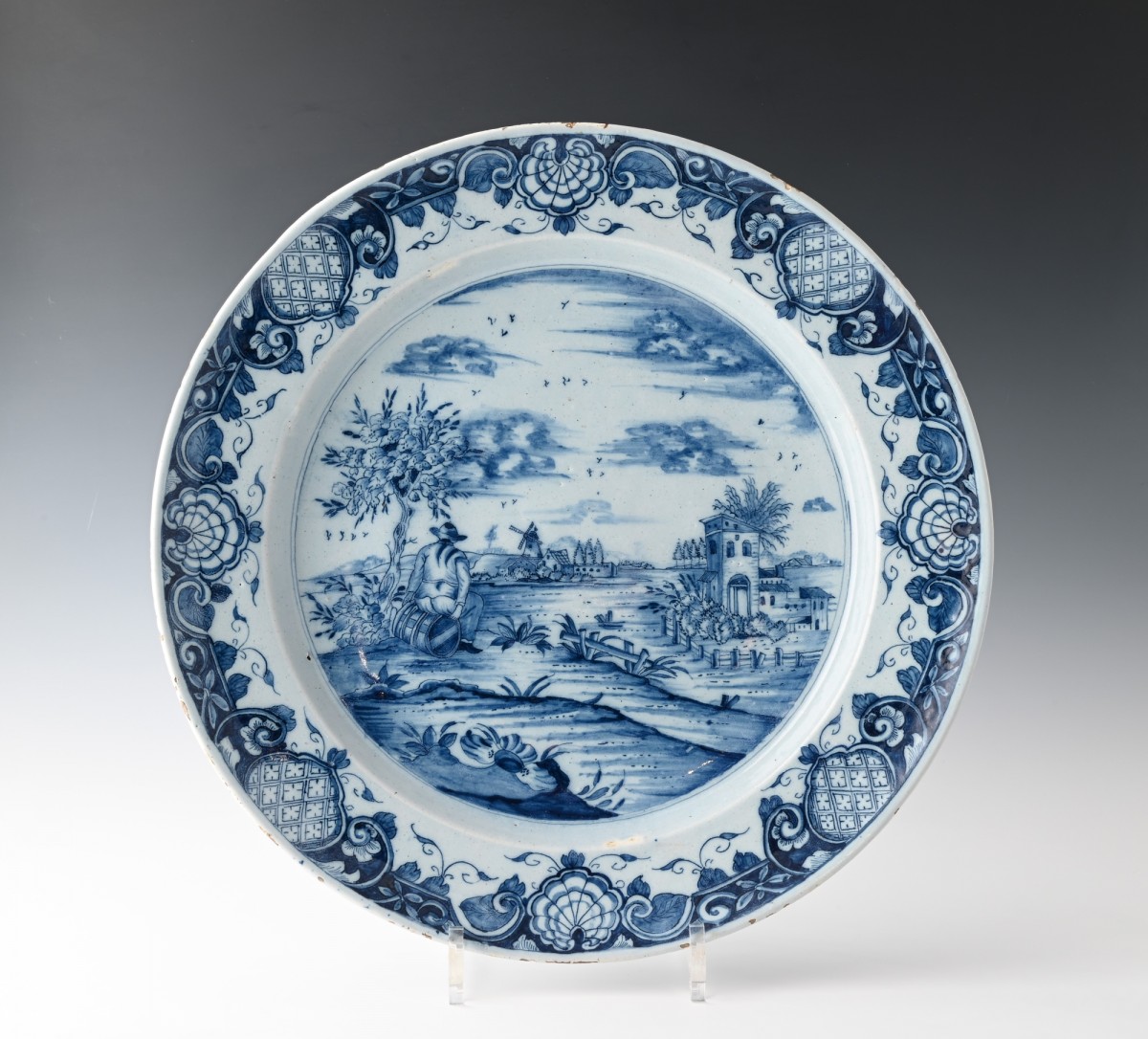A beautiful Delftware dish. Decorated with a Dutch landscape scene.