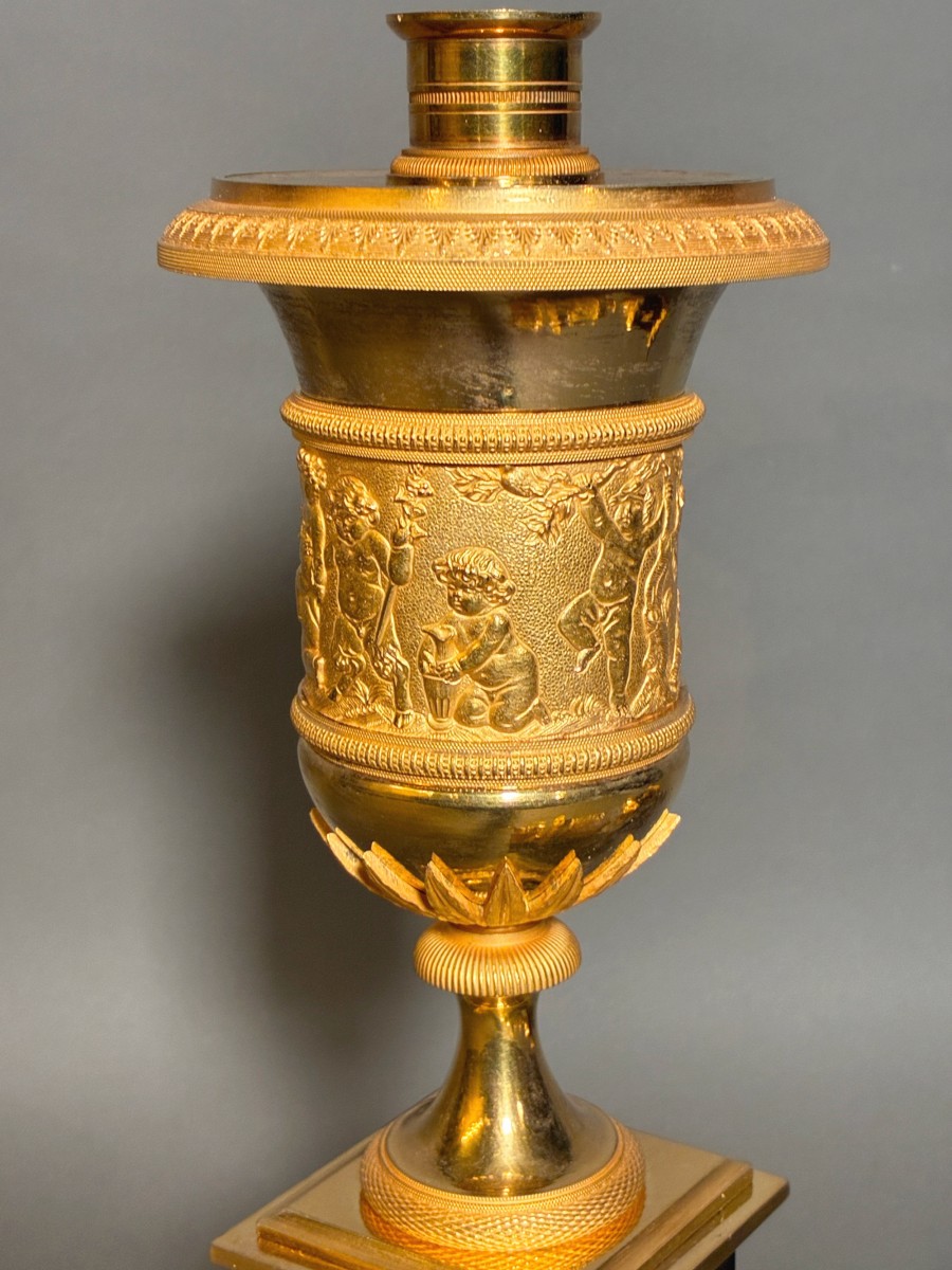 Traditionally attributed to Thomire, this model has recently been reattributed by Jean-Dominique Augarde to the bronze sculptor Jean-Baptiste Héricourt (JD Augarde, "Une nouvelle vision du bronze et des bronziers sous le Directoire et l'Empire," L'Estampille l'objet d'art, no. 398, January 2005, pp. 76-77). This vase-shaped potpourri container, accompanied by a clock and forming a complete set, was designed before 1799, and one of its first recipients was Tsar Paul I of Russia.