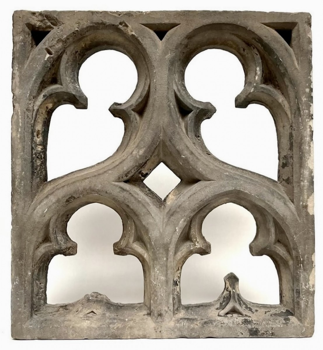 Superb Gothic stone carved tracery or window panel in white lime stone signed with a makers mark .