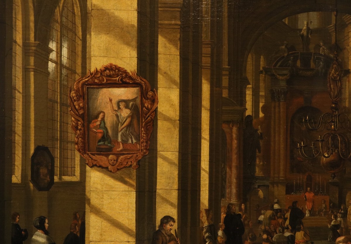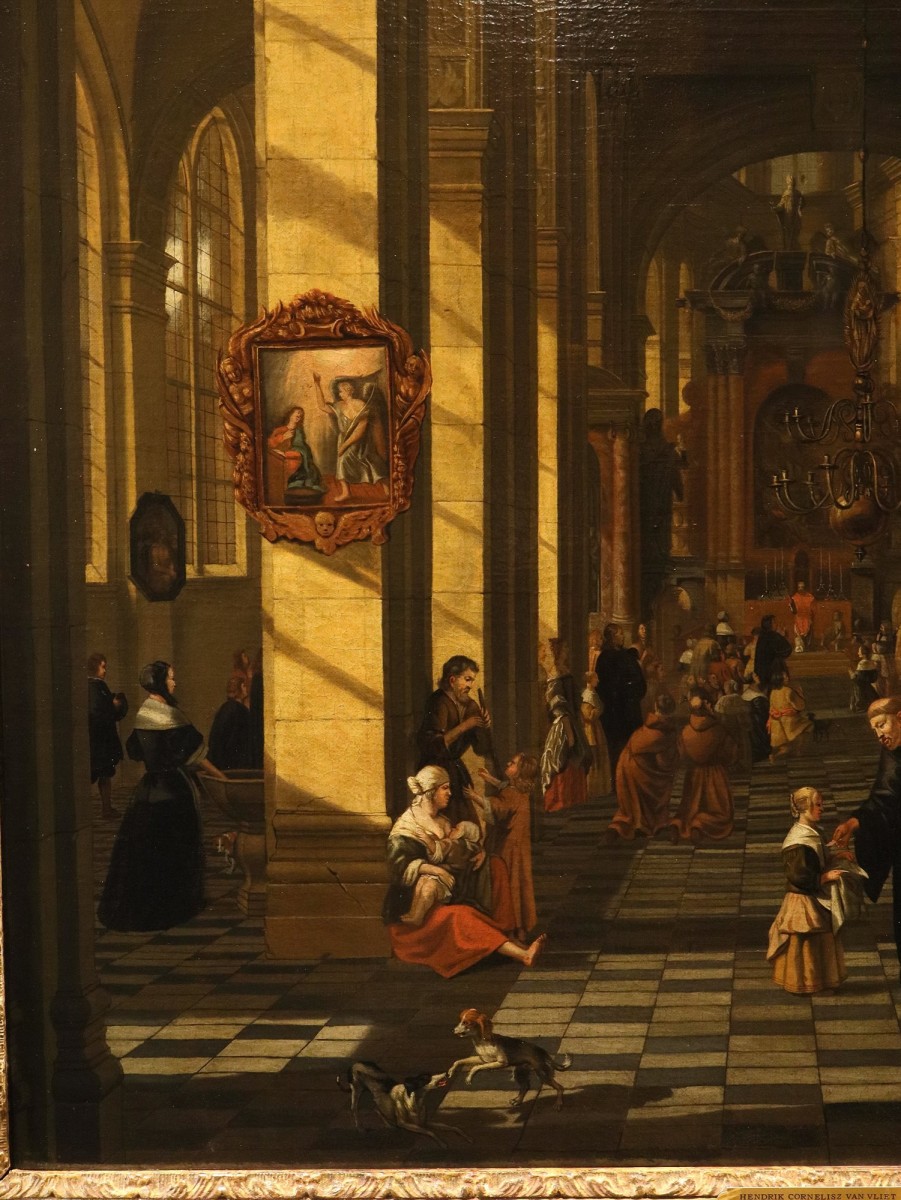 Returning to our painting, there is no doubt that Van Vliet's captivating style succeeds in conveying all the grandeur of the architecture through meticulous attention to detail, with numerous works of art reproduced in great detail: from the paintings placed on the columns of the nave (we see a beautiful Annunciation and a Nativity on the right) to the finely carved wooden pulpit, the stone sculptures and the candelabra hanging in the centre of the nave.