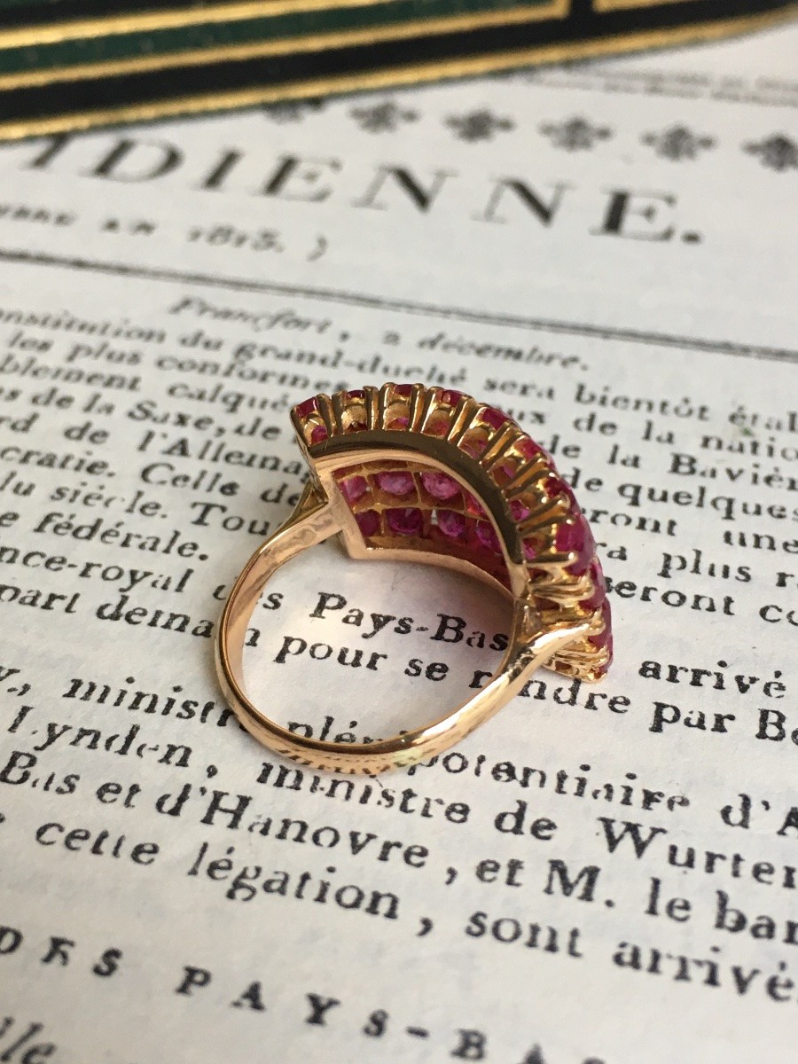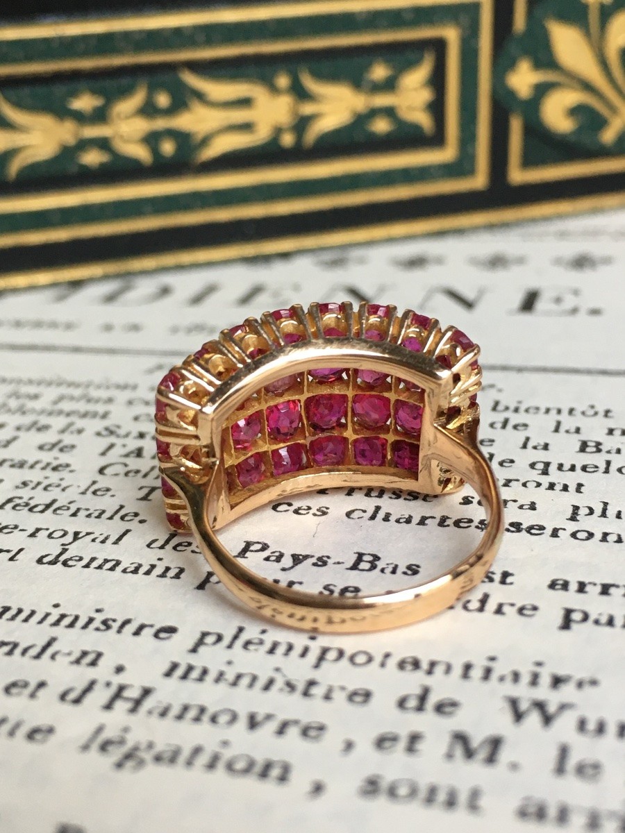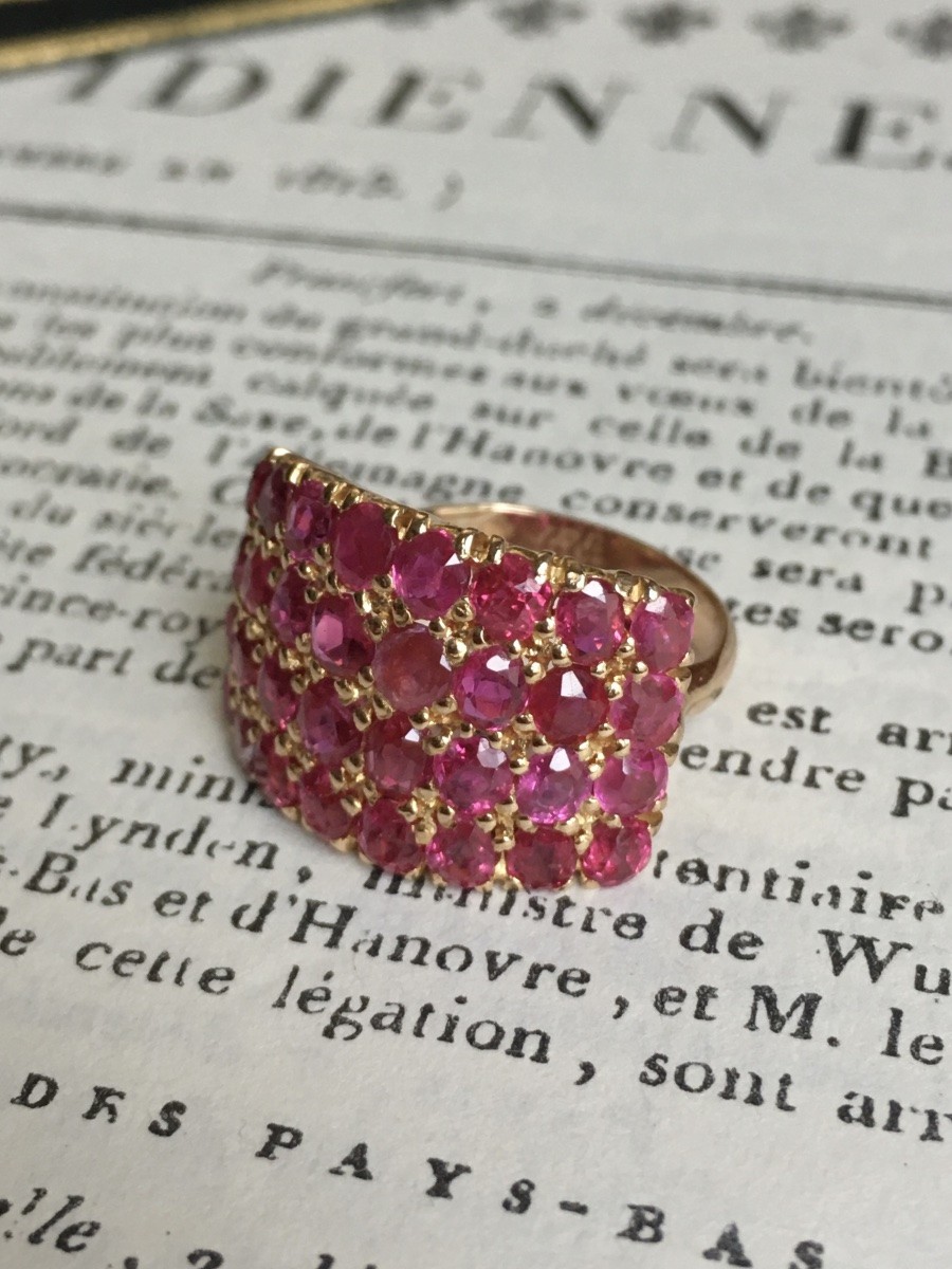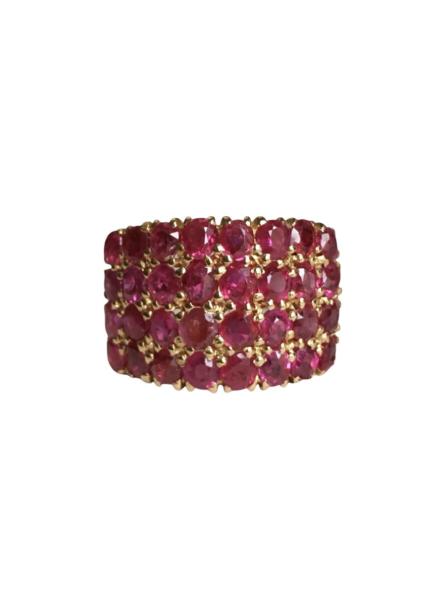 Rectangular 18K yellow gold ring set with a pavé of 32 faceted Burmese rubies