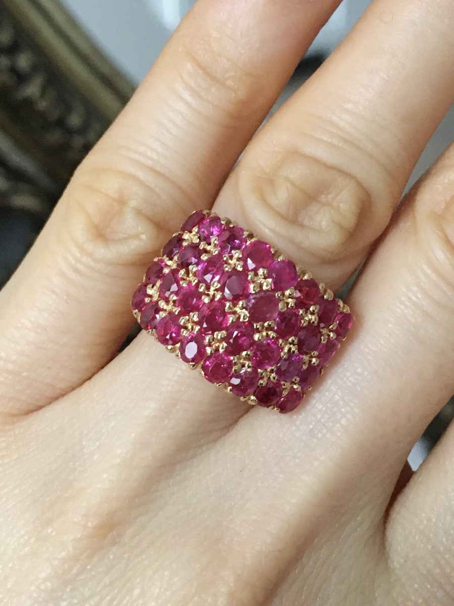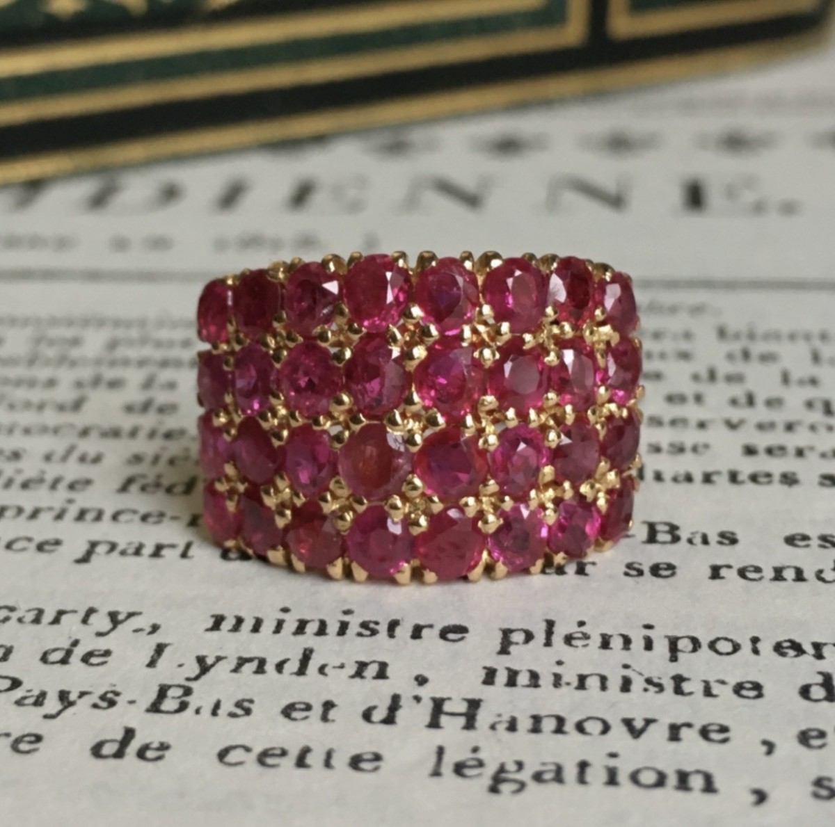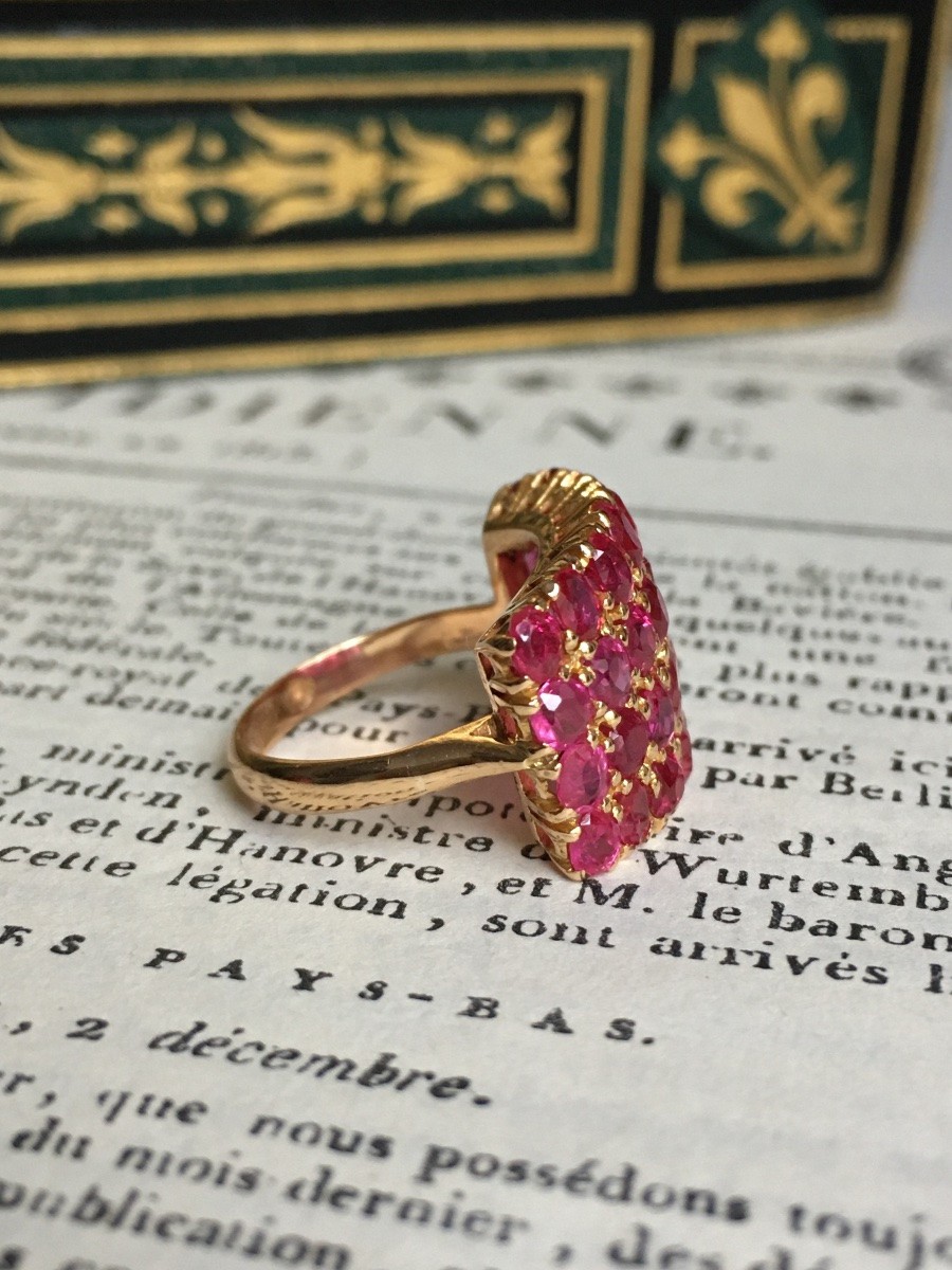 Rectangular 18K yellow gold ring set with a pavé of 32 faceted Burmese rubies