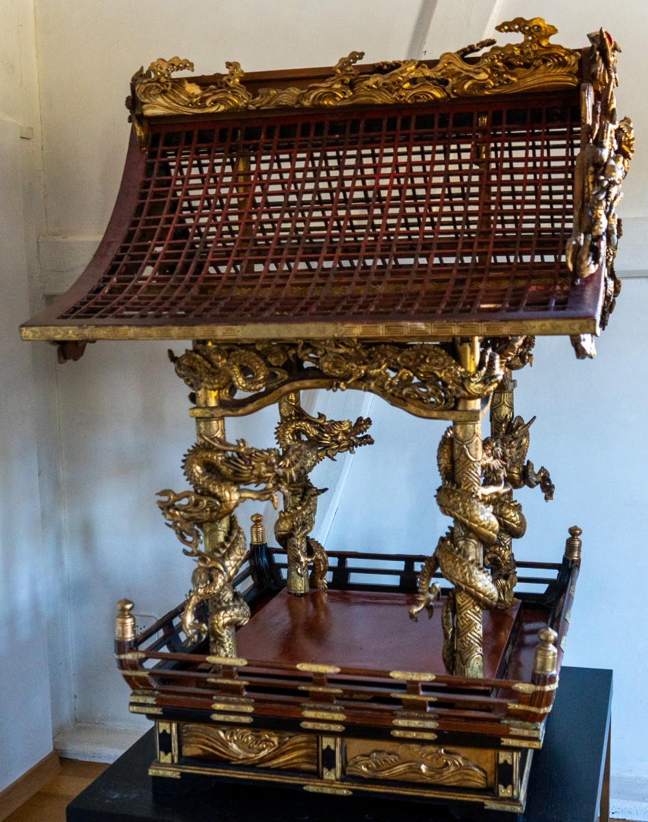 In terms of its design, it compares very closely with another KyKyoden-zushi, now in the British Museum, London (object no 1893,1101.21), which is also made of lacquered and gilded wood and features a similar shaped trellised roof, comparable balustrades around the shrine’s base as well as dragons and other Buddhist symbols and motifs around the roof. The British Museum’s shrine was made during the Edo Period (1800-68) and according to a translation of an inscription on an interior panel, it was made in Nagoya, Owari Province. It is possible that the present shrine originates from the same region. The British Museum’s shrine was one of thousands of artifacts that were donated by Sir Augustus Wollaston Franks (1826-97), who served as the museum’s first Keeper of British and Medieval Antiquities and Ethnography (1866-96).