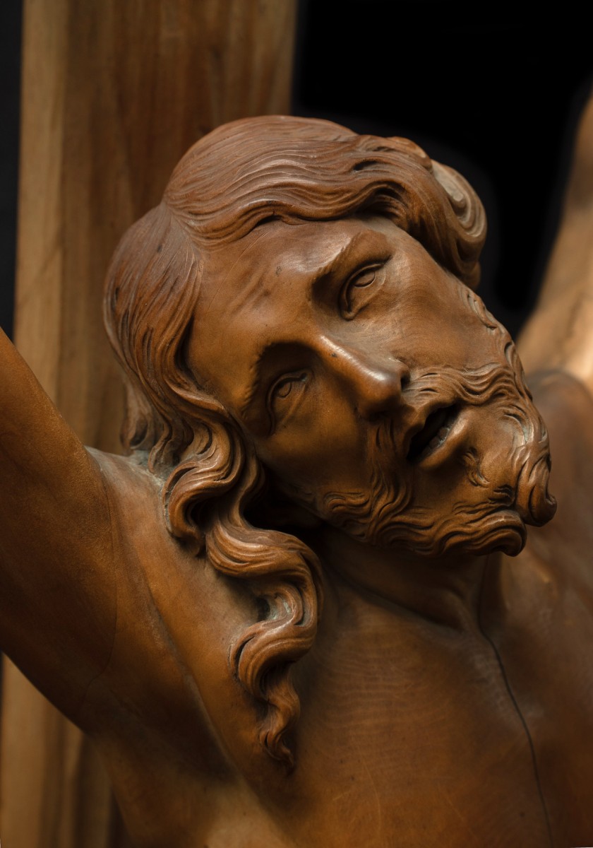 This wonderful sculpture was made for the Jesuit order in Flanders and retains its original cross, featuring a skull at the base - a reference to Golgotha,