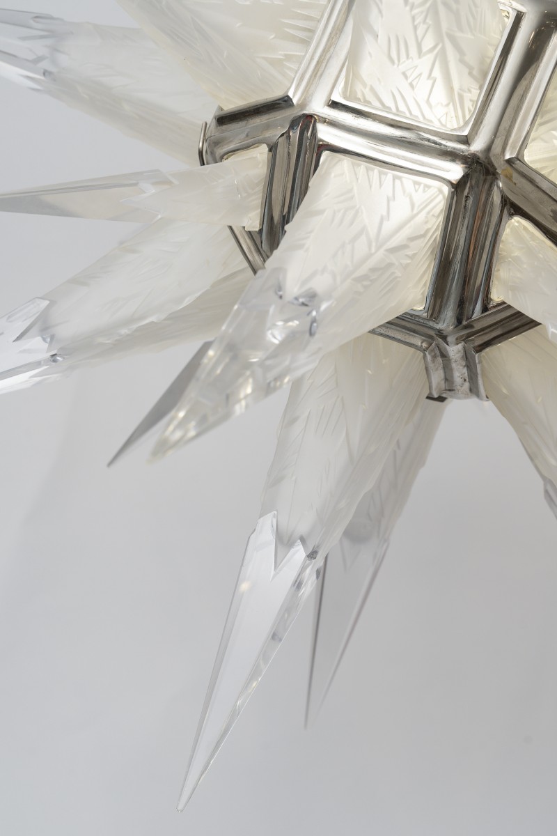 A true suspended luminous sculpture, the “Stalactites” model designed by Charles J. Weinstein circa 1931 fully embodies the spectacular aesthetic of the Art Deco movement. Its architecture evokes a crystalline star or an explosion of ice frozen in time.