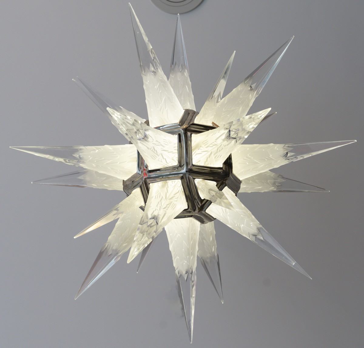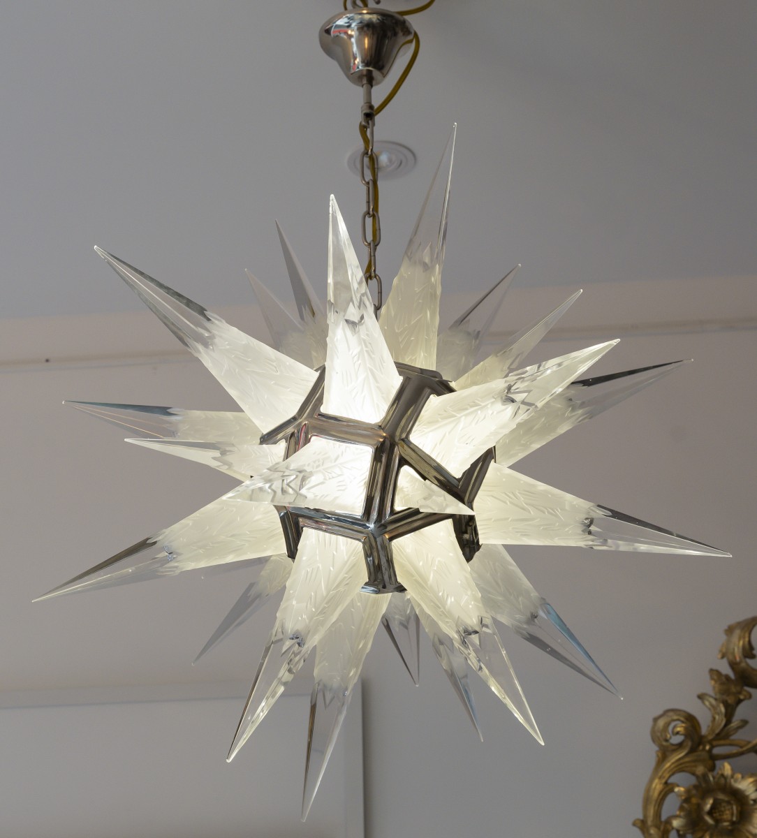 The finely structured metal frame supports a constellation of molded-pressed, cut and delicately frosted glass cones. Each point captures and diffuses the light with subtlety, creating a play of brilliance and transparency of rare elegance. Lit, the chandelier offers a soft and enveloping glow; unlit, it remains a striking graphic and architectural work of art.