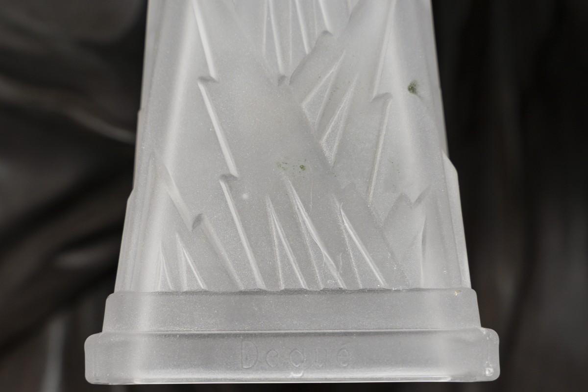 Degué was a renowned Parisian glassmaking house active mainly during the 1930s and 1940s, specializing in Art Deco lighting. The house was celebrated for its exceptional craftsmanship in molded-pressed, cut, and frosted glass, used for high-quality chandeliers, wall sconces, and lamps.