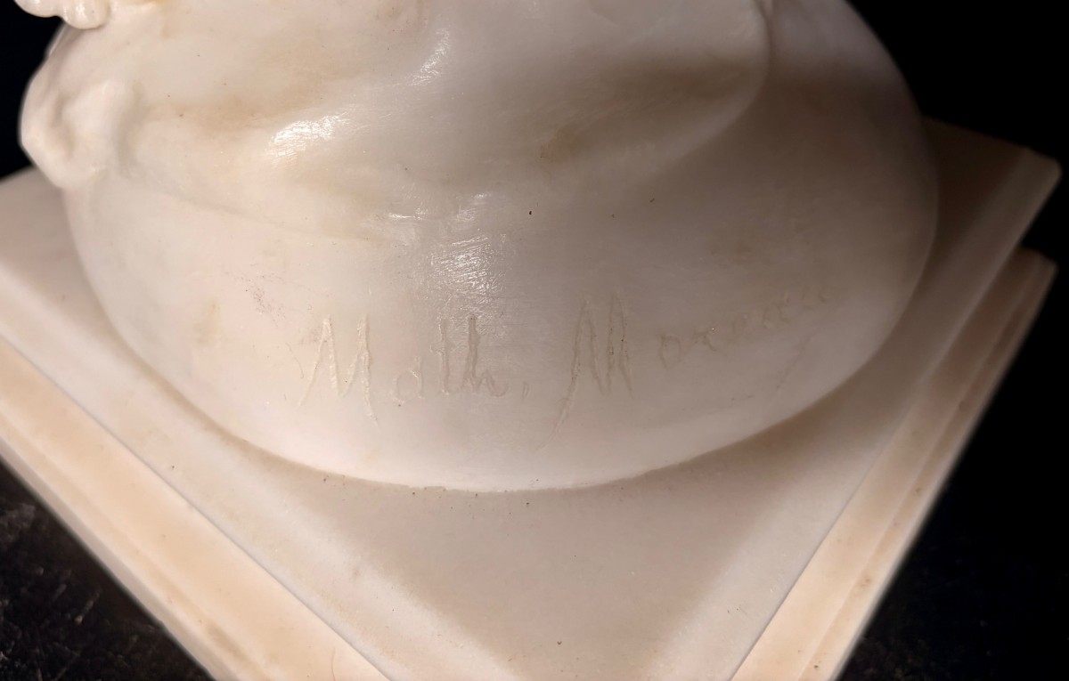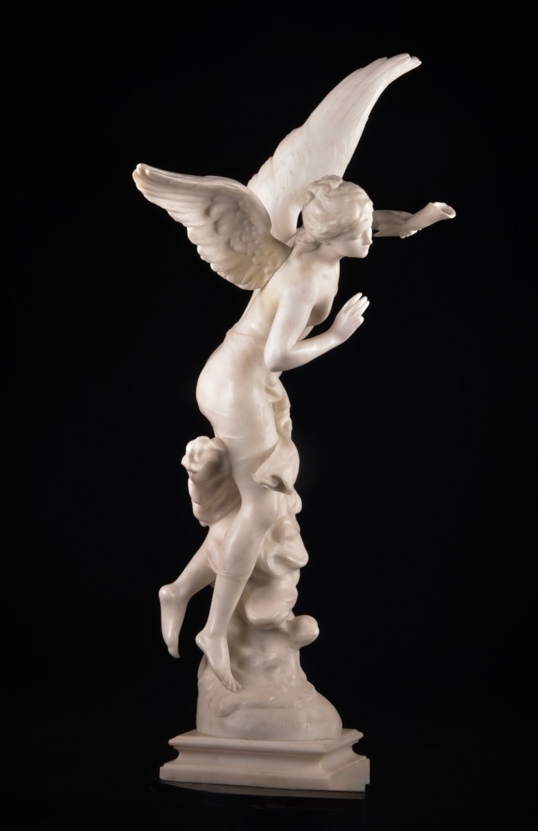 An important Carrara marble sculpture by Mathurin Moreau (1822–1912), depicting an allegorical winged female figure, traditionally identified as "Venus." The figure appears to emerge from sculpted clouds, conveying a strong sense of elevation, movement, and symbolic presence. This is a very rare marble execution of this allegorical subject in Mathurin Moreau's oeuvre, as this type of composition was most often executed in bronze. The delicate carving of the wings, the subtle inclination of the head, and the fluid treatment of the anatomy testify to the sculptor's mastery and sensitivity to movement. The luminous and meticulously polished Carrara marble highlights the depth of the modeling and the interplay of light on its surface. Preserved in very fine original condition. Dimensions: 88 × 52 × 32 cm. About the artist: Mathurin Moreau (1822–1912) was one of the most prominent French sculptors of the 19th century, renowned for his allegorical and mythological figures. He exhibited regularly at the Paris Salon and played a significant role in the dissemination of sculpture during the Second Empire and the Belle Époque. His works are now held in public collections and regularly appear in major international auctions.
