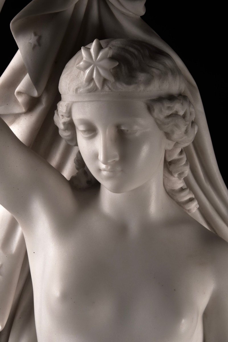 "Night," Carrara marble, signed and dated 1872. Imbued with celestial serenity, Night embodies the ethereal grace of 19th-century Italian sculpture. Sculpted from remarkably fine Carrara marble, the figure stands on a globe, her veil rising like a constellation of stars—a poetic allegory of the night sky. The delicate features and finely modeled draperies reveal the undeniable mastery of the Carrara workshops, where Demetrio Caruji worked in the great classical tradition. A comparable example of this rare model is listed at Christie's, sold on April 21, 2021, confirming the importance of this work within the artist's refined oeuvre. Dimensions: 108 × 40 cm. Material: Carrara marble. Signed: Demetrio Caruji / Carrara 1872