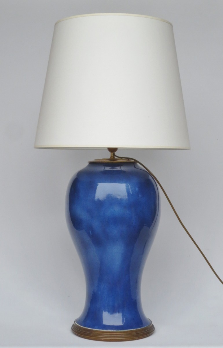 This baluster-shaped lamp is described as monumental due to its exceptional dimensions. Its powdered blue colour results from a technique that appeared during the reign of Kangxi (1662–1722), consisting of blowing cobalt blue directly onto the body of the piece through a bamboo tube fitted at the end with gauze. This process produces a sprinkling of small, more or less dark speckles and gives the surface a slightly iridescent appearance.