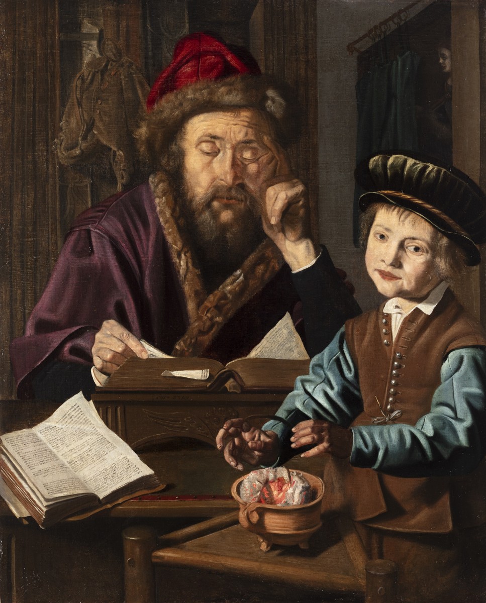 This unusual and finely preserved canvas is best read as an allegory of winter, both seasonal and spiritual. A richly dressed older man red-nosed, tired-eyed sits inside a shadowy interior with a child by his side, their hands extended toward a small brazier. The painting plays on multiple levels. On the surface, it’s a literal scene of winter warmth bundled figures huddled indoors, surrounded by books and account papers. But as in Stap’s better-known compositions, there’s a deeper allegorical layer at work. The brazier (often a vanitas symbol), the meditative pose of the man, and the intergenerational exchange of warmth, hint at broader themes of aging, wisdom, transience, and stewardship.