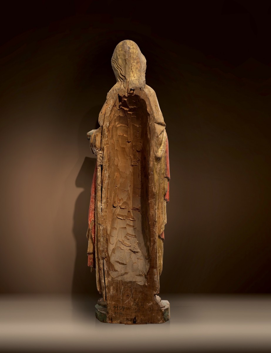 John appears here as an exalted preacher of penance, equipped with his typical attributes: The robe of camel hair – symbolizing the ascetic way of life – is carved with astonishing delicacy. The hair is curled almost symmetrically and thus arranged in a heart shape. Above it is a golden cloak with a red lining, held together with a brooch, the splendor of which forms an exciting contrast to the saint’s simple way of life. The saint stands barefoot on the floor slab – an emphasized grounding that refers to his desert existence. The sinewy feet with elongated toes once again point to his asceticism. In his left hand he carries a book, presumably the Holy Scriptures, as a sign of his role as a preacher. His right hand is raised in a classic preaching gesture: The middle and index fingers as well as the thumb are pointing upwards, a telling expression of his prophetic mission. The long-limbed fingers have naturalistically shaped fingernails and notches on the palm, giving the figure an impression of closeness.